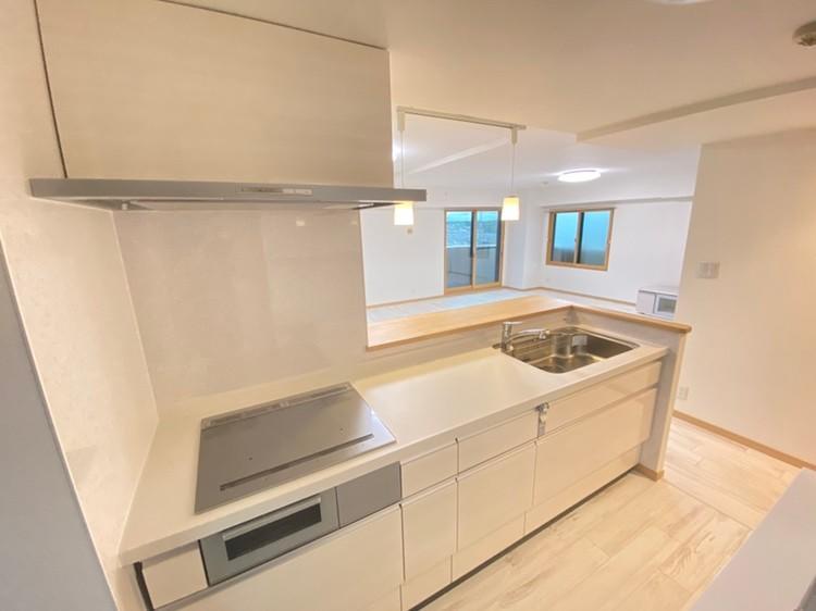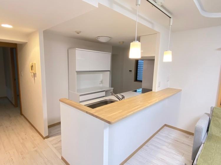 キッチンや床も明るい色をベースにし、キッチンの壁を取り払い、リビングと一体化したことで広々とした開放感のある空間に生まれ変わりました。お客様からも大変お喜び頂いております。