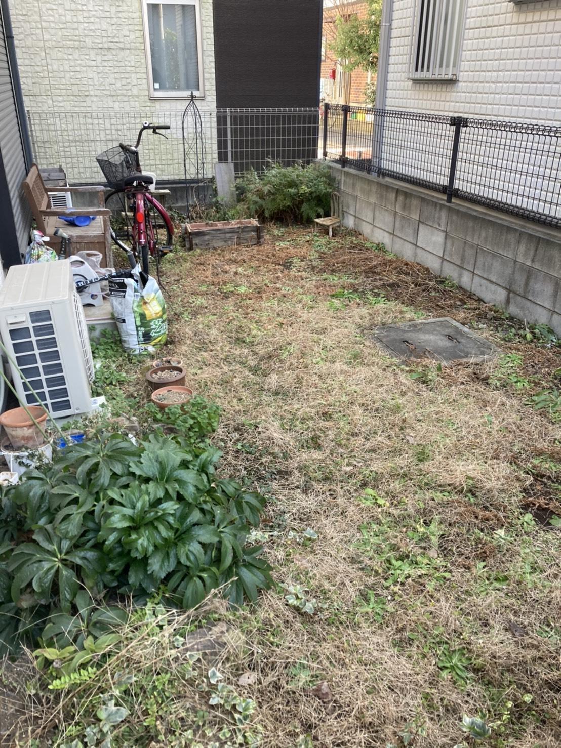 人工芝に変え、物置・塀を設置しました。