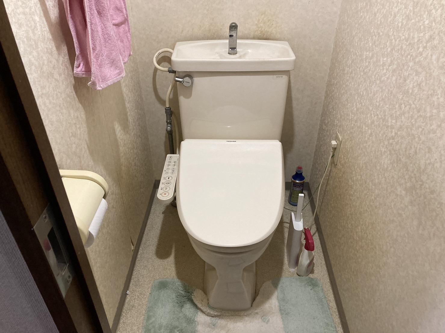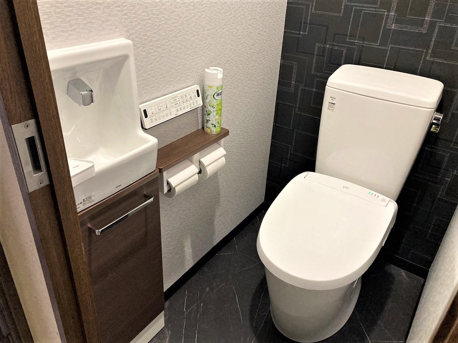 トイレ空間は床と壁のアクセントが全体を引き締め、手洗いを別にすることで使いやすく掃除もしやすくなりました。