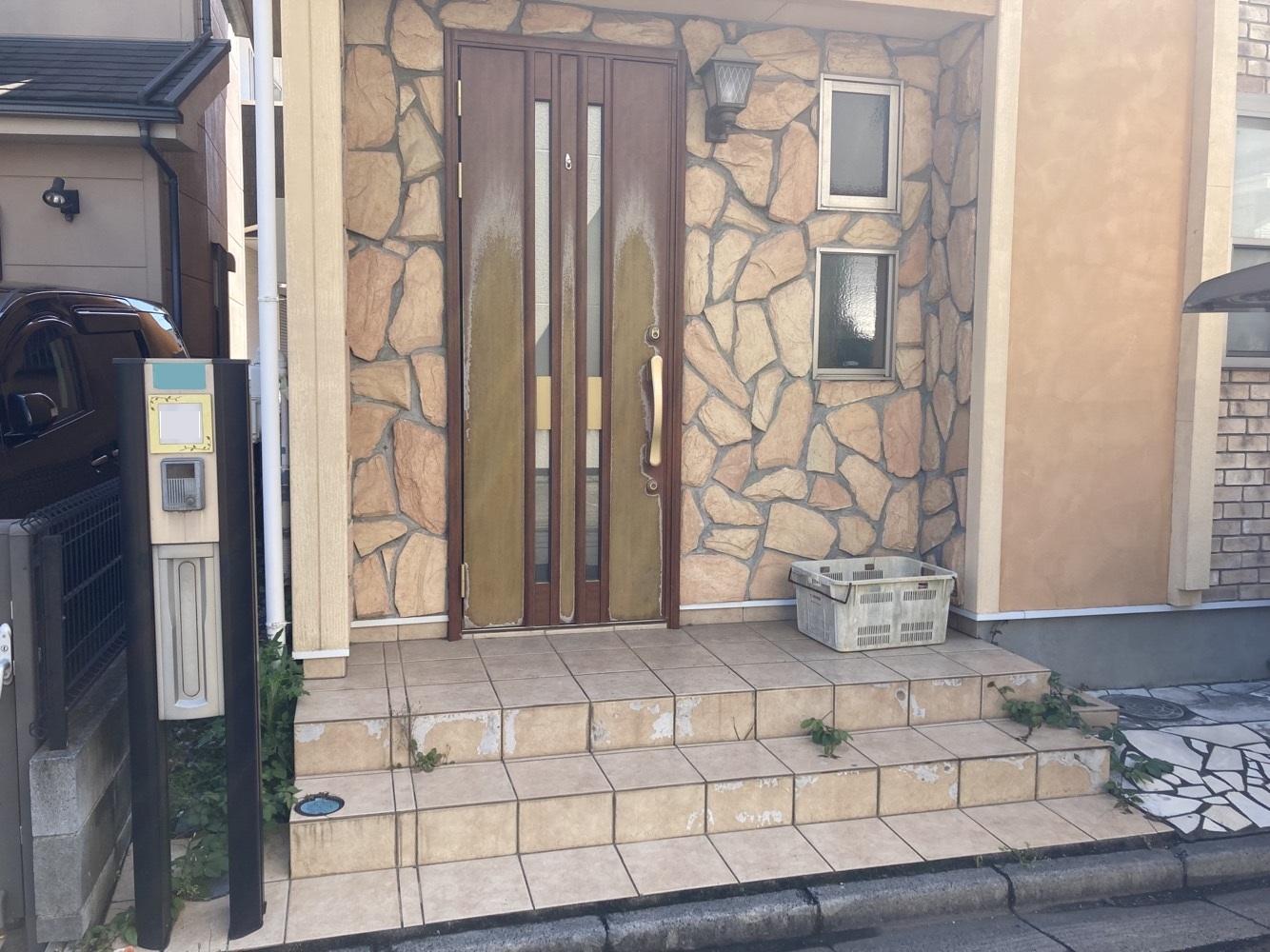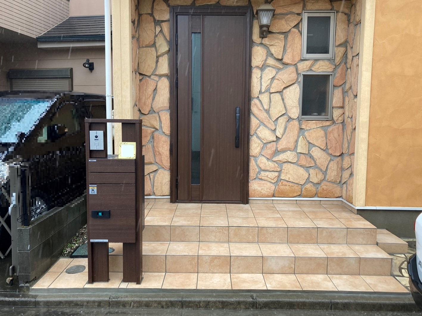 塗装が落ちてしまったドアをカバー工法でリニューアル。 断熱性もアップして家の中も快適になりました。 門柱ポストも宅配ボックス付きに交換したので、留守の時にお荷物が届いても安心です。