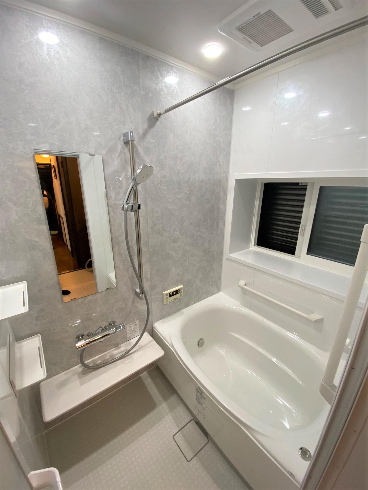 在来からシステムバスへリフォームし暖かく快適な空間になりました。 機能面でもカウンターを折りたためたり、取り外して丸洗いすることができます。 棚もマグネットでお好みの位置へ取り付けられるので大変便利です。