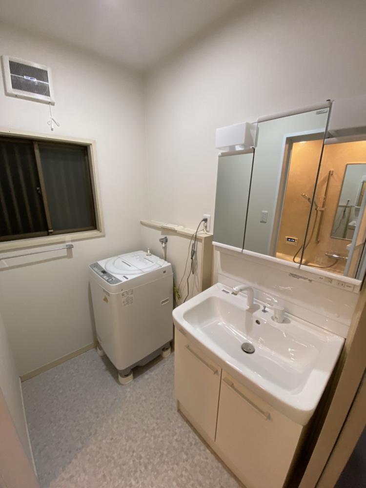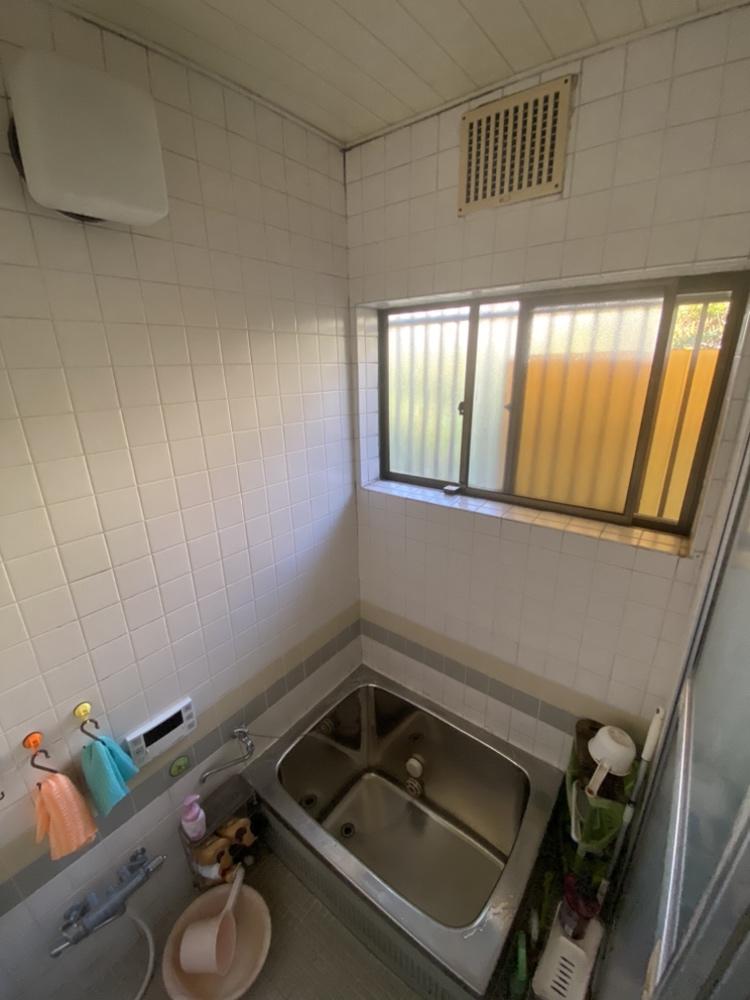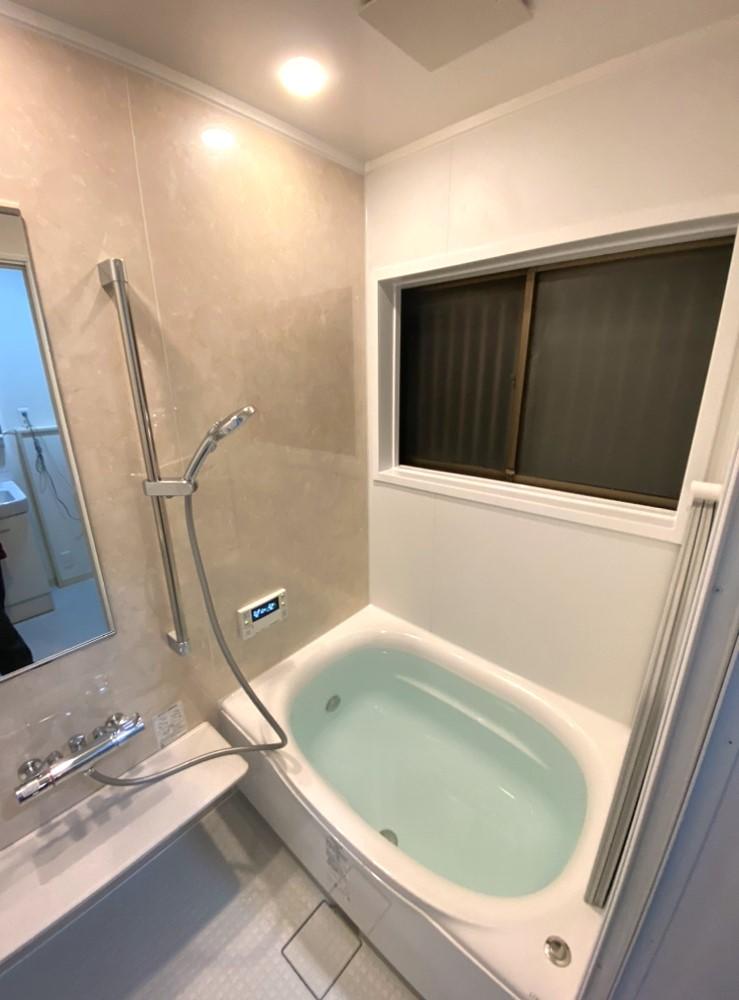在来の浴室からユニットバスへリフォームしました。 浴室の入り口の引違いドアを半分壁にして、 浴槽を横幅いっぱいに広げました。 明るく断熱効果もアップして暖かくゆったりとくつろげる空間になりました。