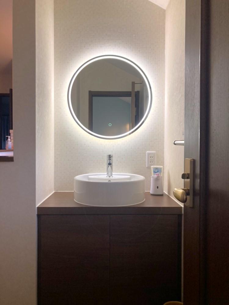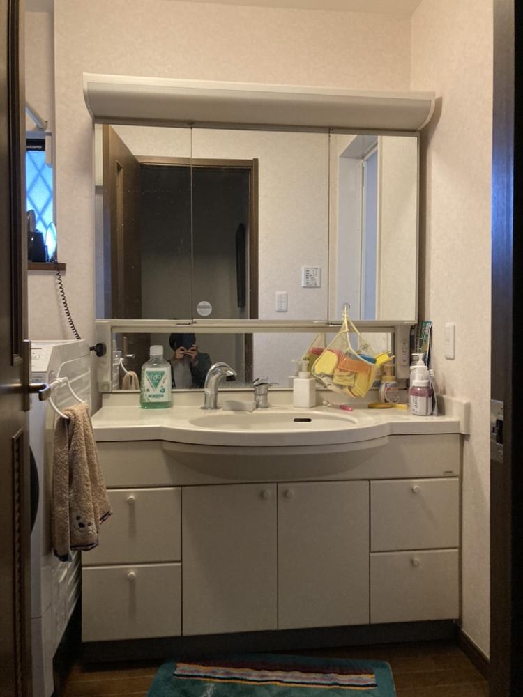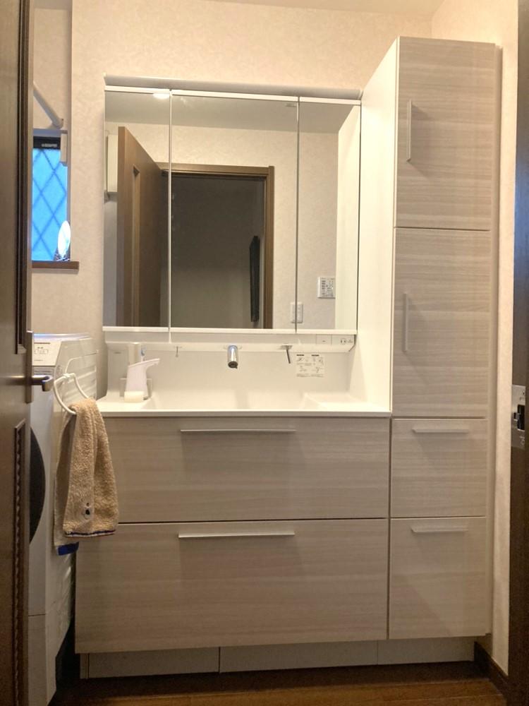 1階と2階の洗面台交換のご依頼をいただきました。 1階の洗面室には奥行560mmタイプの洗面台を採用し、大容量収納ですっきり収納できる洗面空間になりました。 2階の洗面室には、どんな場所でもコンパクトに収まるドレッサーを採用。 壁紙は正面の1面のみ違う柄でアクセントクロスを選定し、おしゃれな空間になりました。