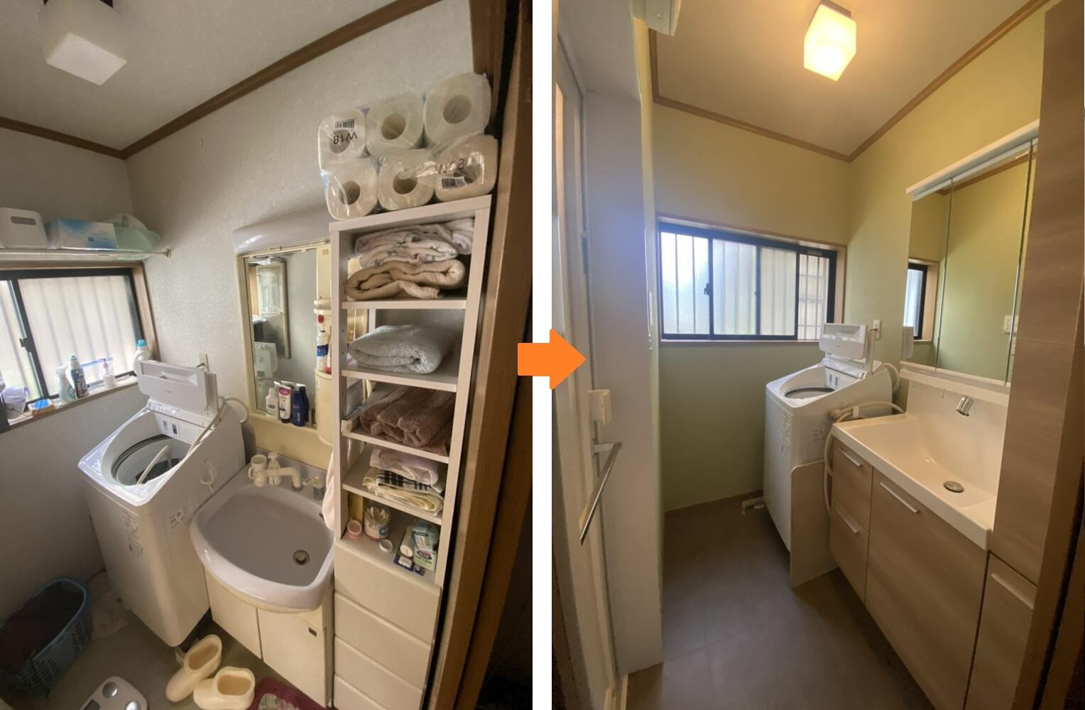 1F・2Fの洗面化粧台はLIXILクレヴィへ交換し、明るい色の壁紙が柔らかい印象の洗面室になりました。