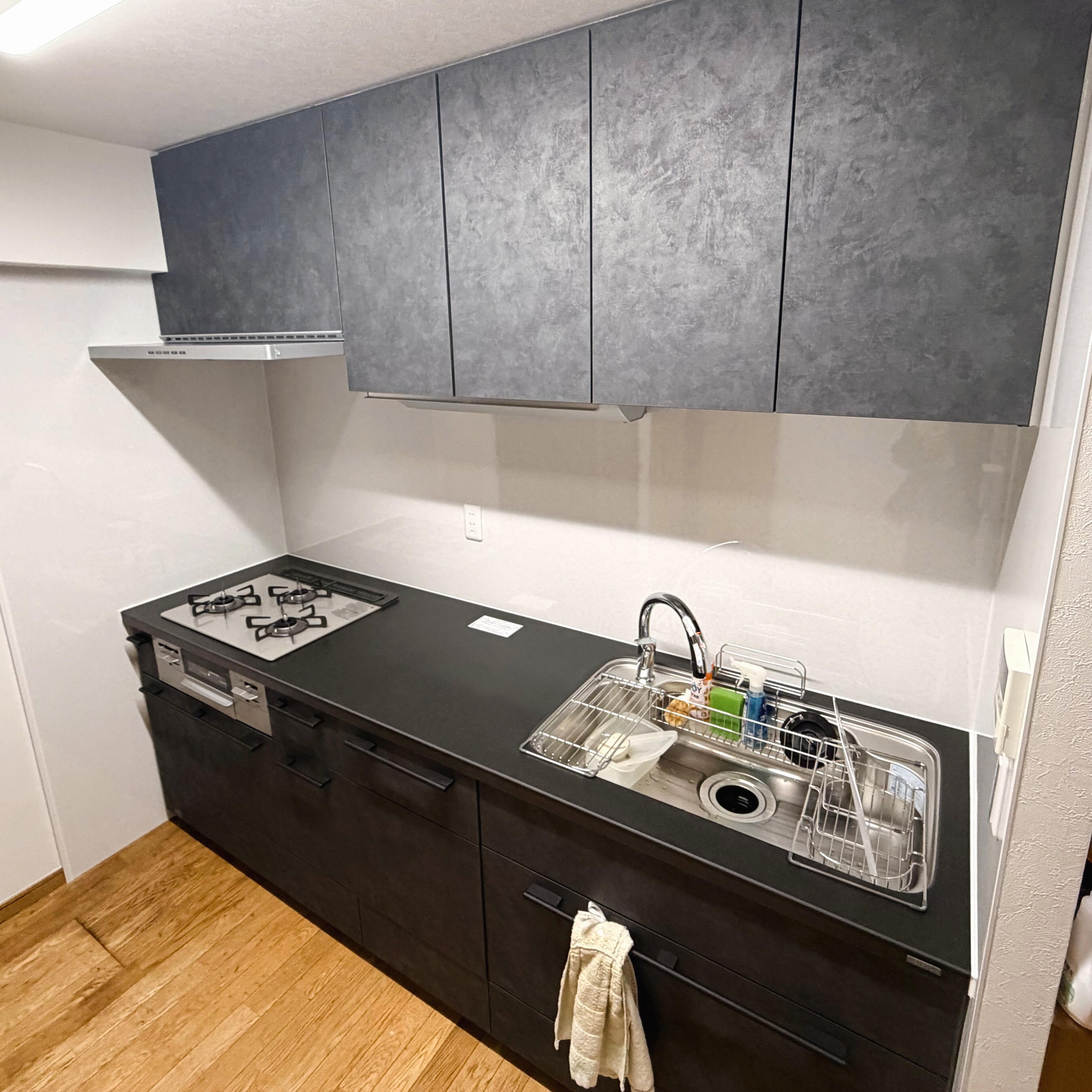 重厚感のあるグレーカラーの面材とブラックのワークトップが、落ち着いた高級感を演出しています。