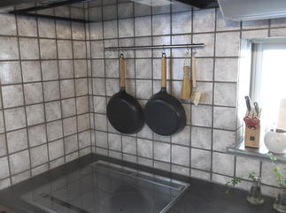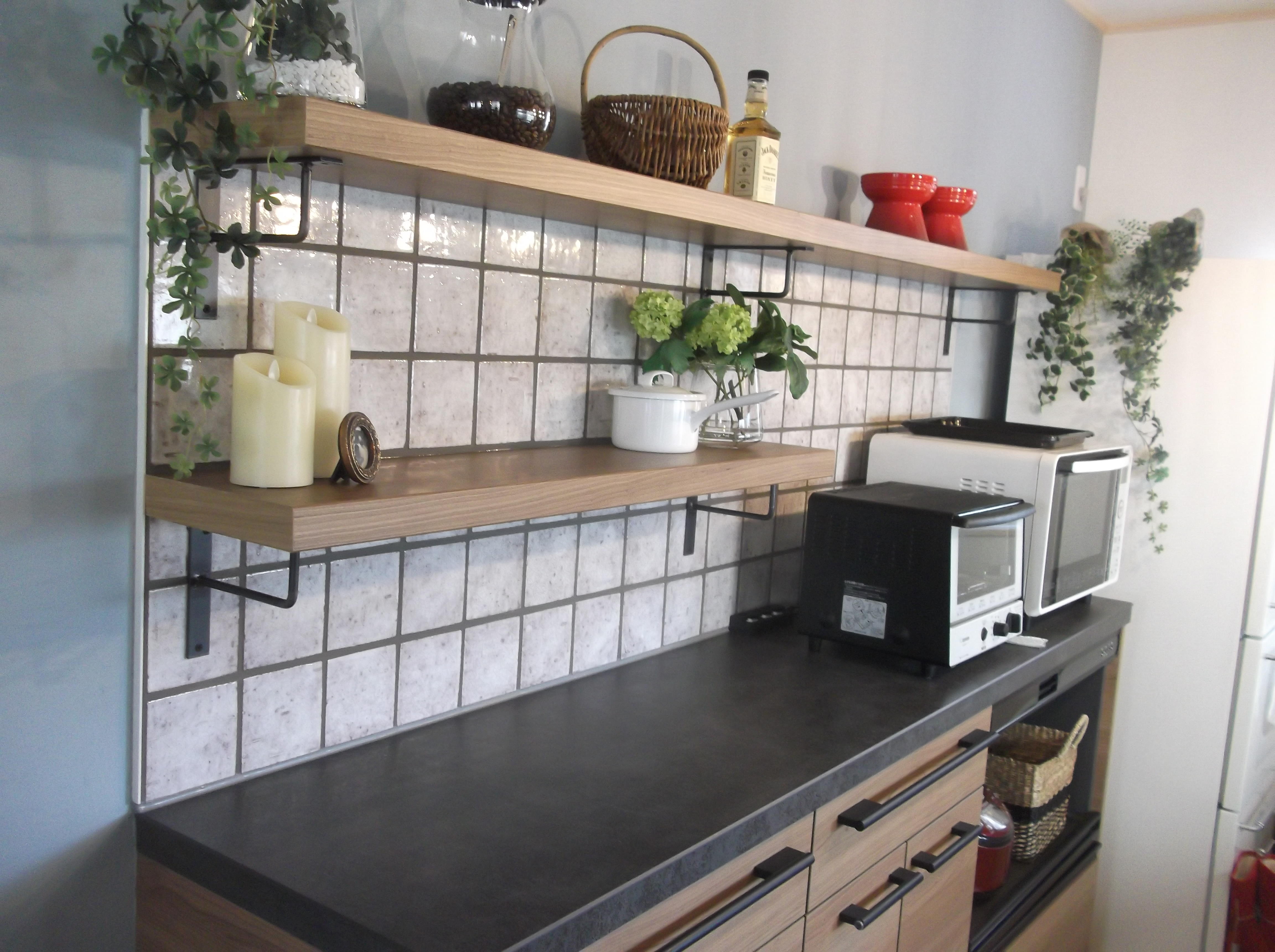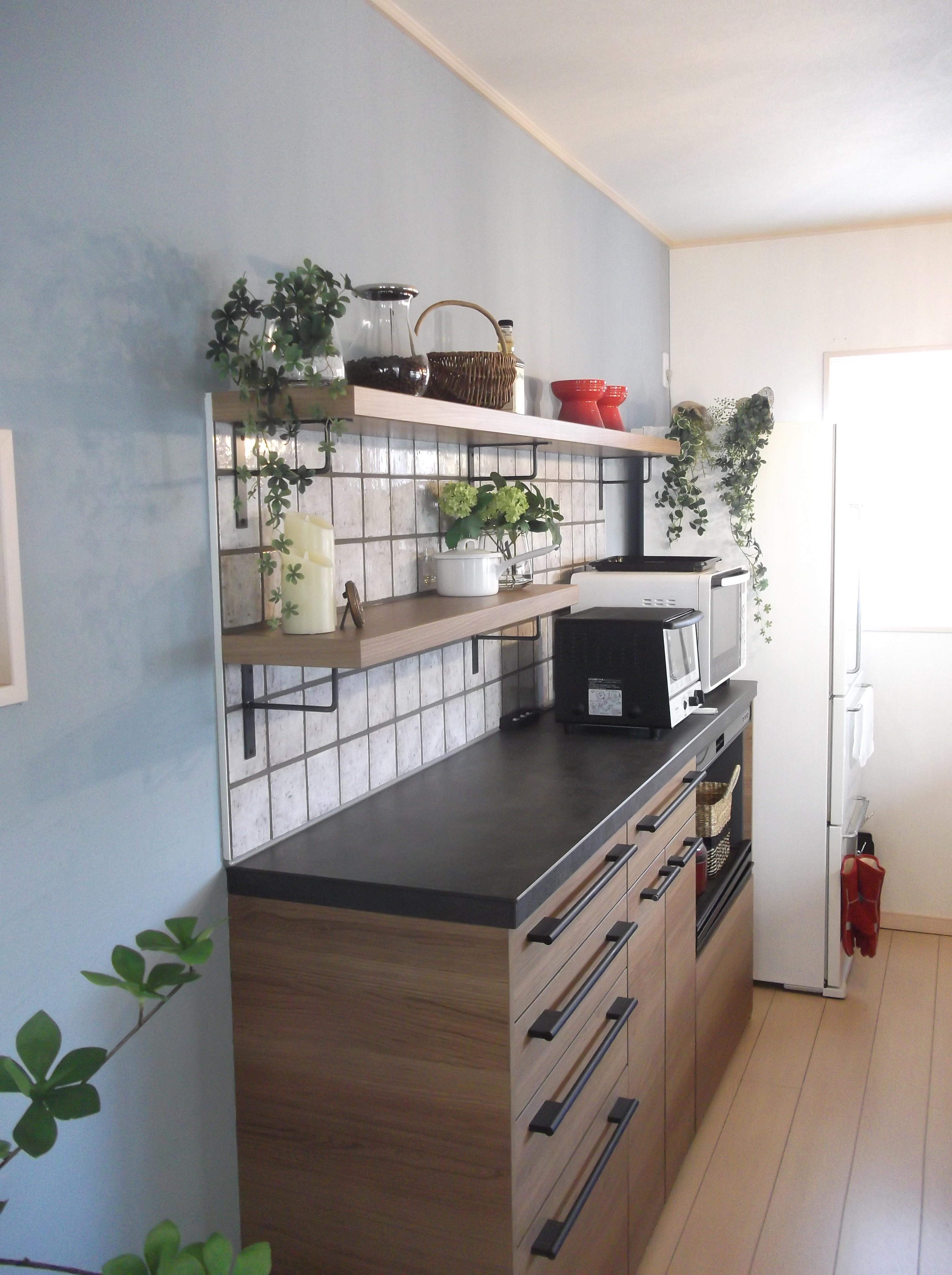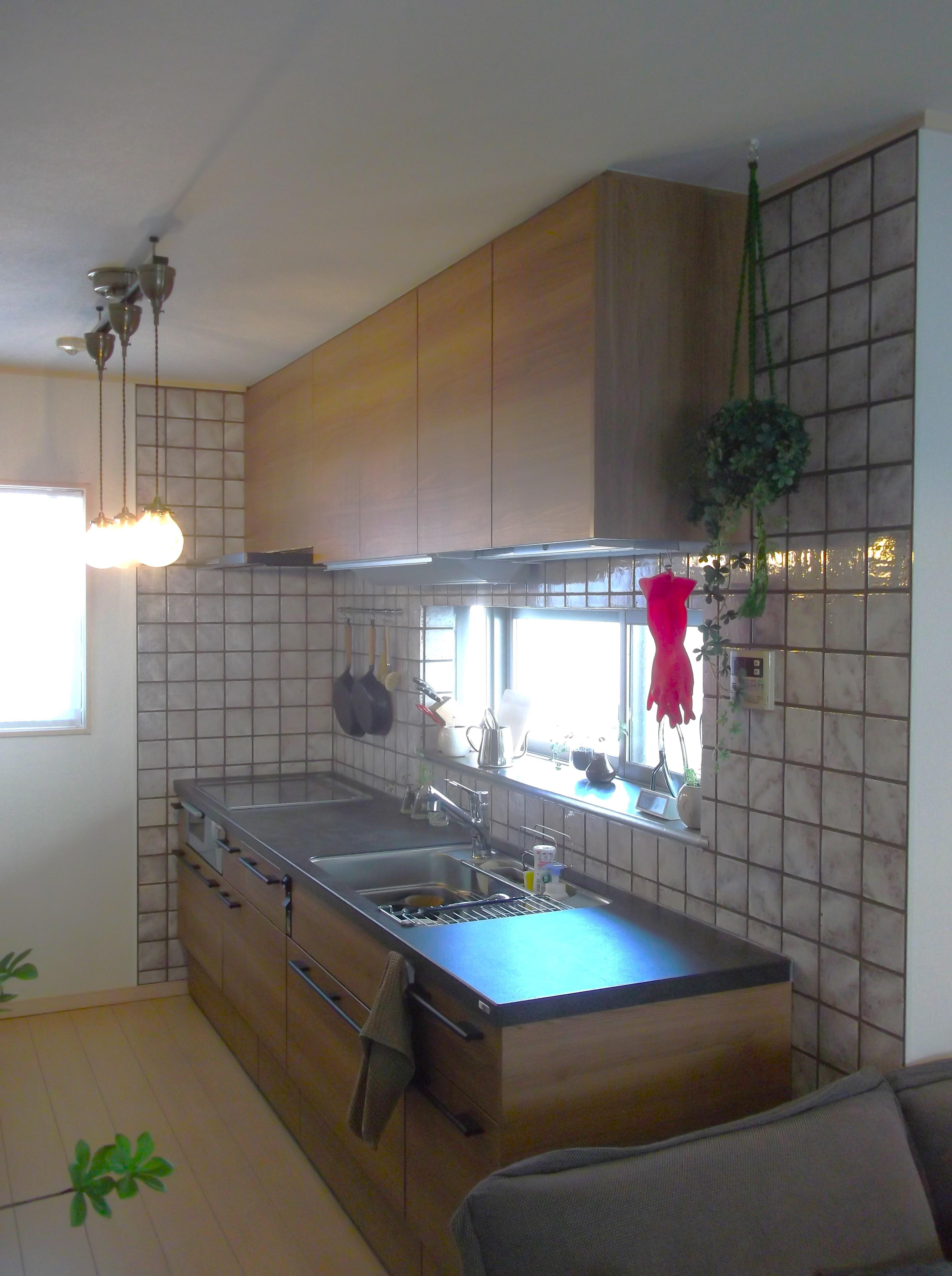 キッチンの機能や色味はもちろん、キッチン周りの壁、照明、装飾等、お客様のこだわりで、とても落ち着いた雰囲気に仕上がりました。塗り壁の部分はご施主様ご自身で珪藻土を施工され、職方さんもビックリする程キレイな仕上がりです。リシェルの良さを一段とひきだしてくれるキッチン配置になりました。