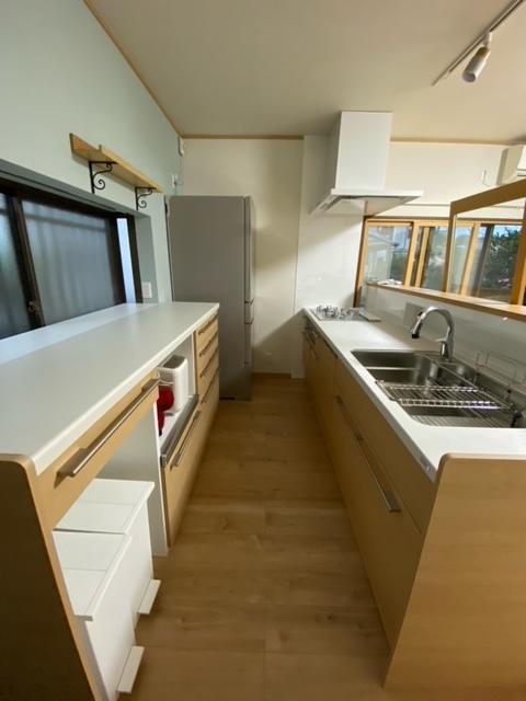 暗かったキッチンを明るい空間にと壁付I型キッチンからオープン対面キッチンにリフォーム。背面のカウンター収納は、出窓の天板に高さを合わせたので奥行もあり広々と使用できます。新設キッチン前の腰壁にはニッチ棚を設けたり、設備や建具なども明るく柔らかな色味にし、おしゃれなインテリア空間のように仕上がりになりました。