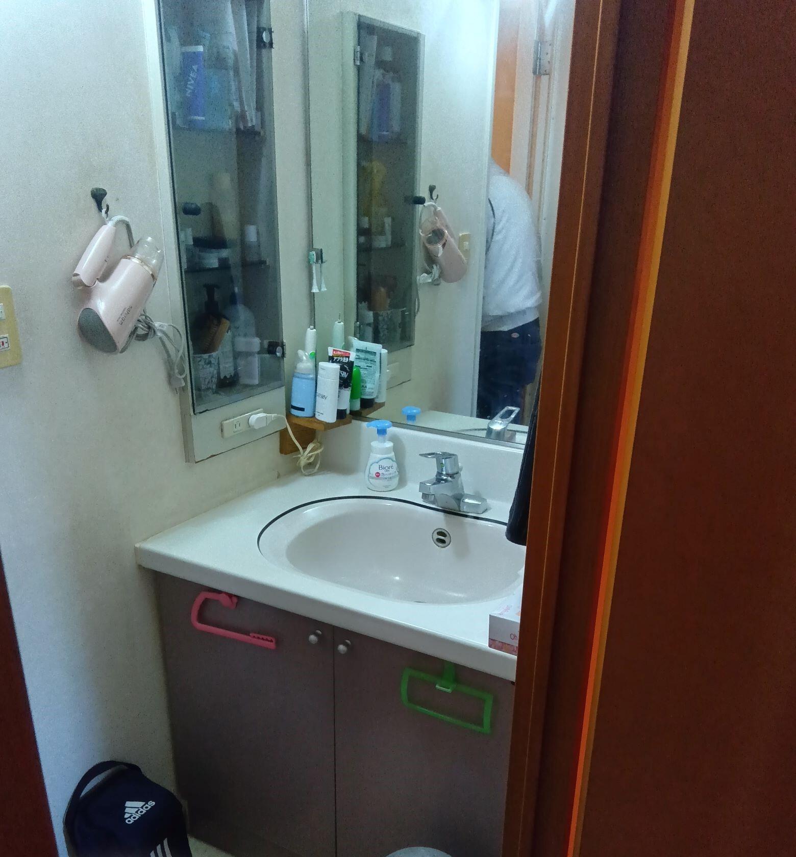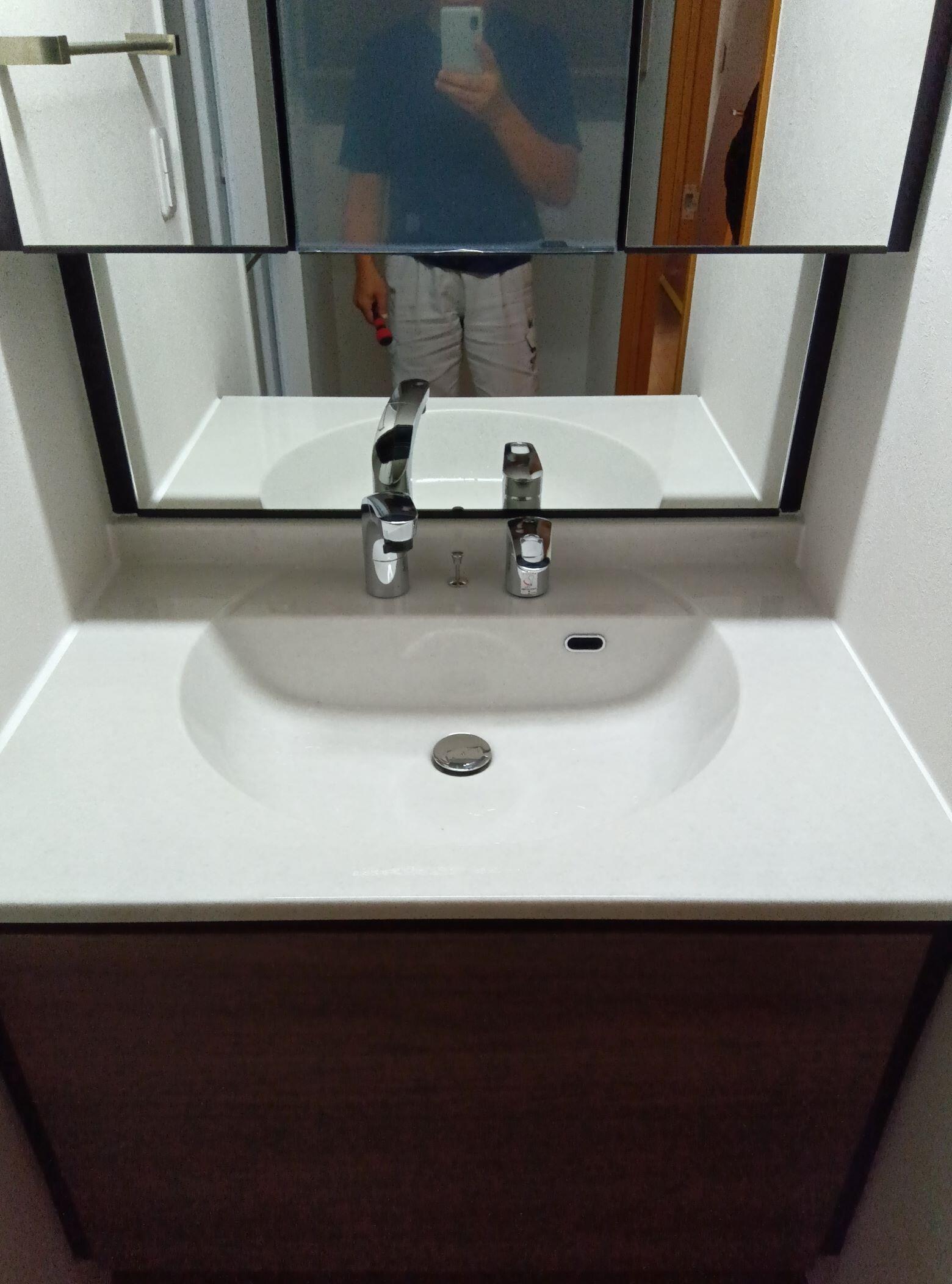 洗面台の改修工事を行いました。 リクシル商品ルミシスを採用いただきました。 多面鏡のミラー裏は、すべて収納スペースになっているので、周辺小物がすっきり片づけられます。
