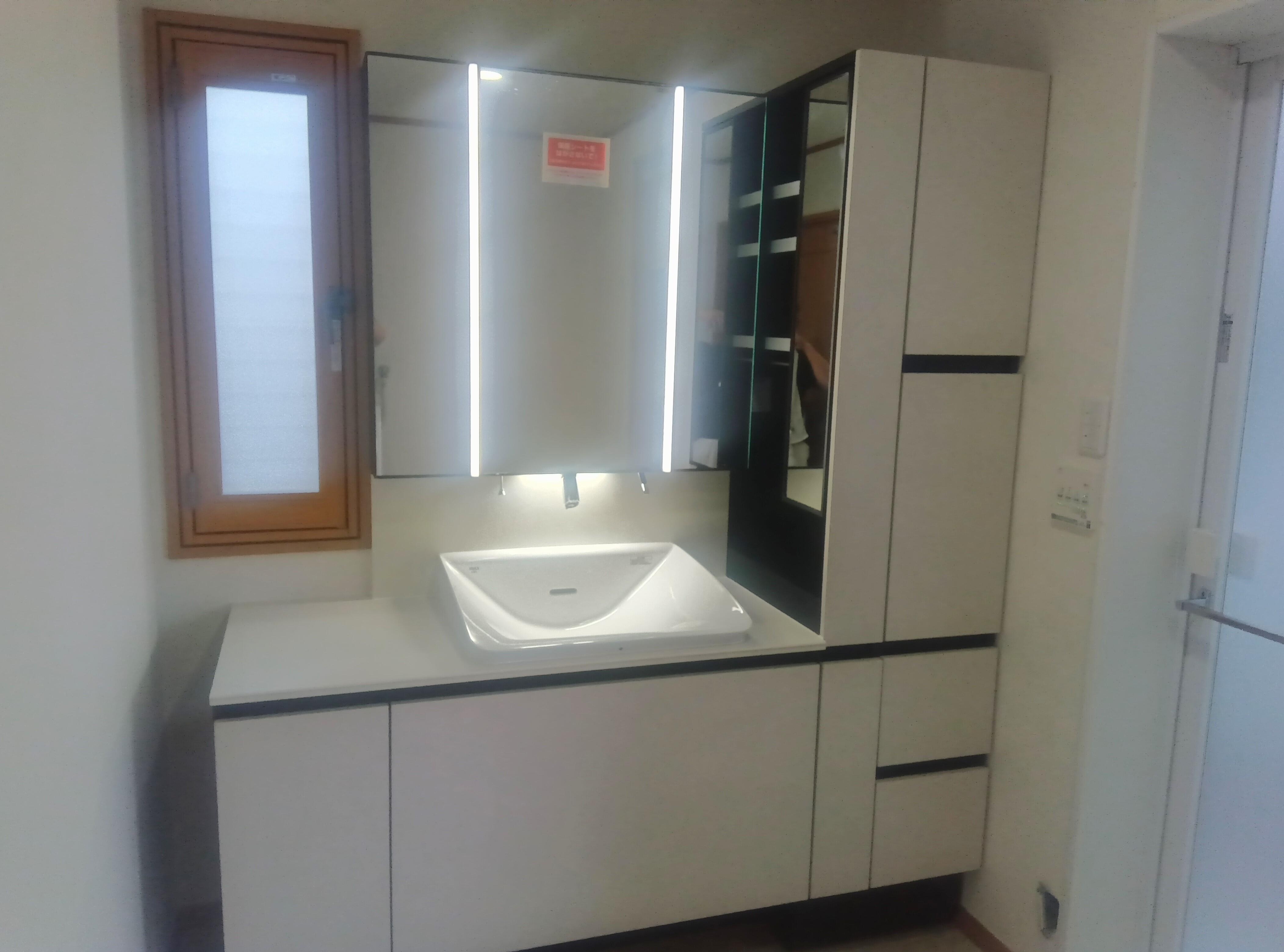 洗面台の改修工事を行いました。 リクシル商品ルミシスを採用いただきました。 洗面室としての機能美を追求したルミシス ハイバックベッセルタイプ。 お手入れしやすいキレイアップ水栓と、その水を包み込む流麗な形状をしたボウルデザイン。 ゆったりとした広さで洗いものがしやすく、デザインだけでなく機能性を重視する方に適しています。