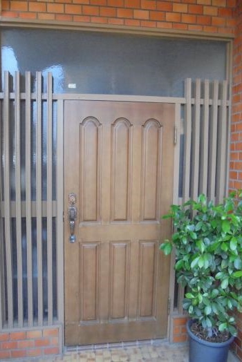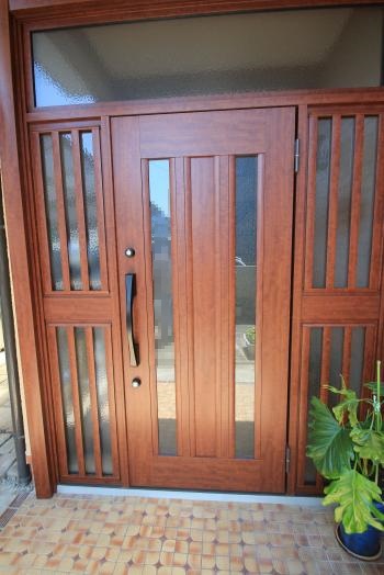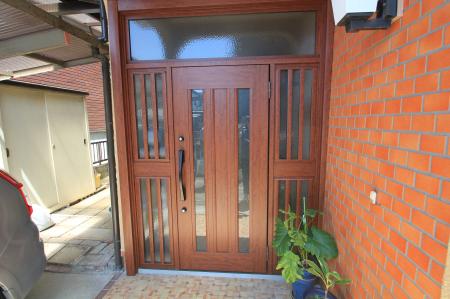 玄関ドアリフォーム。玄関は、『リクシル リシェントⅡ』 アルミ仕様 両袖ランマ付を採用。断熱性、採光性また防犯にも優れています。コンクリート土間部分補修工事も合わせて行いました。重厚感があり、素敵な仕上がりになりました。
