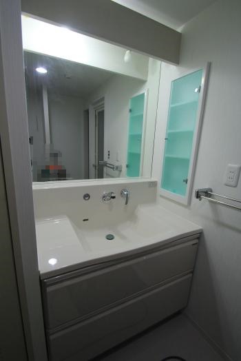 トイレはタンクレスタイプをご希望でしたが、マンションに合うもの、工期、価格等、相談させていただき、【TOTO GG手洗い器付】をご提案させていただきました。また、洗面化粧台は、今まで使われていた一面鏡は、とても気に入られていて、今回も大型ミラーにしたいとのことでしたので、ご希望に合ったデザインのものをお見積りさせていただきました。