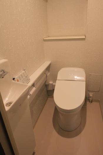 マンションのトイレ・洗面化粧台リフォーム。トイレは【TOTO GG手洗器付】です。 タンクレストイレのようなすっきりとしたデザインです。見た目はタンクレス”風”なのですが、小型のタンクが付いていて、後ろ側は少し盛り上がっています。大掛かりな給排水工事は必要ありません。