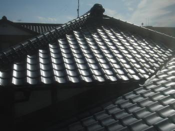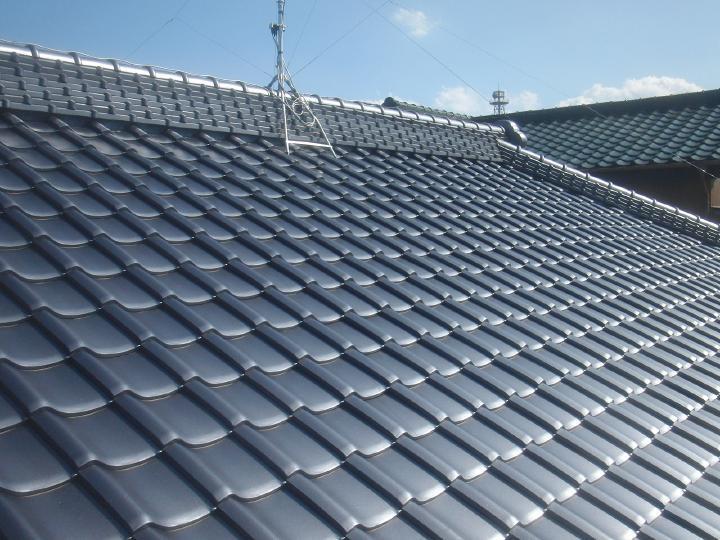 入母屋つくりの屋根葺き替えリフォーム。屋根瓦は、和型銀黒です。趣きのある飽きのこない屋根に仕上がりました。銀黒色は、キラキラとした輝きがいつまでも続き、瓦屋根を際立たせます。