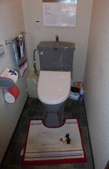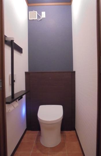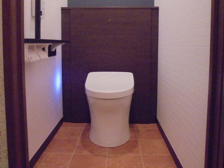 水漏れをきっかけに、トイレの入れ替えリフォームを行いました。完成したトイレは、TOTO レストパルです。タンクレスのように見えますが、タンクは便器背面のキャビネット部に隠れており、スッキリとしたトイレになりました。I様が気にされておりました壁につながる配管もキャビネット部に納まりました。収納も兼ね備えておりますので、トイレ用品もきれいに片付きます。