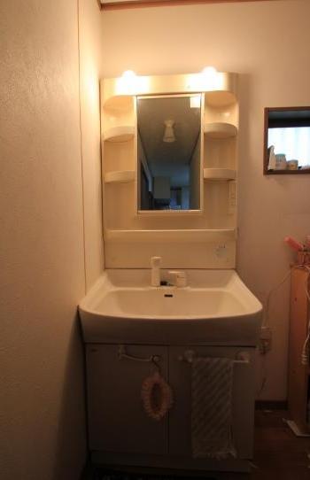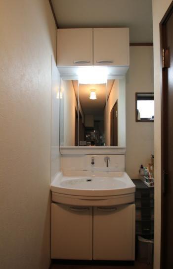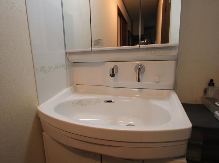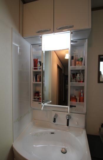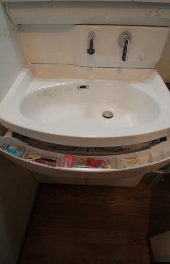 洗面化粧台入れ替えを行いました。洗面化粧台は、【タカラスタンダード オンディーヌ】です。汚れに強いホーローに期待。上部にはキャビネットを設置し隙間を有効活用しました。