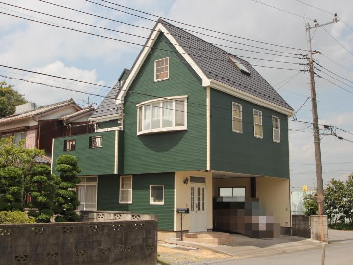 外壁・屋根ともに劣化が目立つようになってきたのでリフォームを検討しているということでお声掛けいただきました。外壁は美観性・遮熱性・耐候性等に優れた塗料アステックペイントリファインでの塗装です。外壁の色はだいぶお悩みのようでしたがシミュレーションを重ね、グリーンをメインにホワイトの縦のラインをいれたデザインになりました。屋根は調査したところ激しい劣化はみられませんでしたので、既存の屋根の上から新しい屋根材をかぶせるカバー工法です。屋根材は軽量かつ断熱効果のあるIG工業ガルテクトです。
