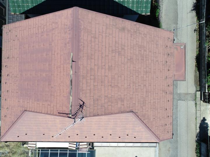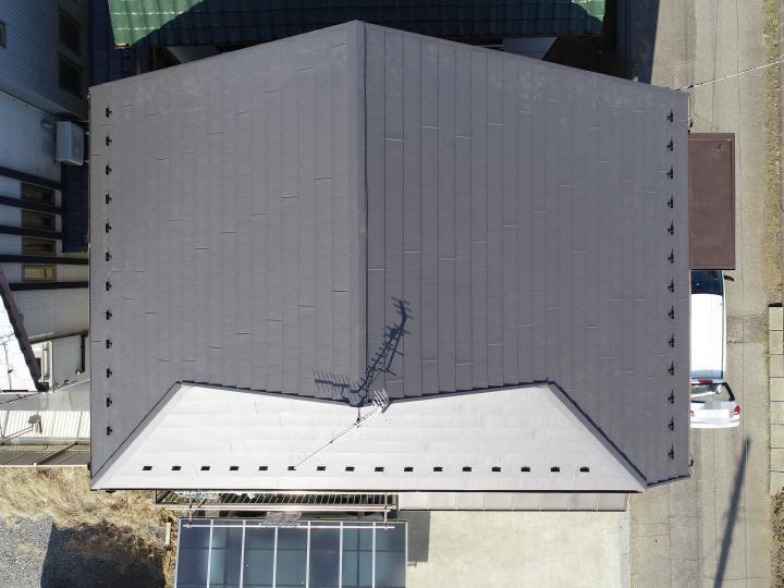 ドローンカメラを使い屋根の様子を確認させていただきました。棟がめくれ屋根の一部が剥がれている状態でした。また全体に劣化具合も進んでいることがわかりました。下地の傷みは少なかったため、既存の屋根の上から新しい屋根材をかぶせるカバー工法をご提案しました。屋根材は軽量で断熱性、耐久性に優れたガルテクトです。施工後もドローンカメラにて全体の仕上がりを確認させていただきました。