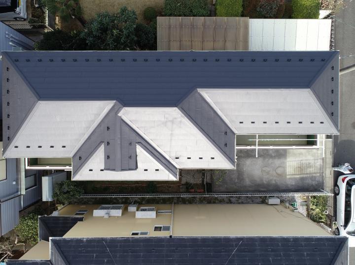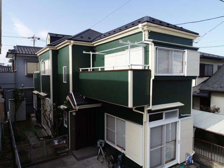 屋根はだいぶ劣化が進んでいましたが、下地の傷みは少なかったため、既存の屋根の上から新しい屋根材をかぶせるカバー工法をご提案しました。屋根材は軽量・断熱効果のあるガルテクトです。外壁は今までとはイメージをがらりと変えグリーンがメインです。塗料は遮熱性・耐候性に優れたアステックペイントです。また外壁にあわせて玄関ドアもリフォームしました。リクシル「リシェントドア3」、カバー工法ですので1日で施工が可能です。