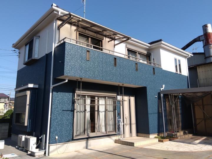 築年数が経過し外壁の汚れが目立つようになったのがきっかけで、外壁塗装リフォームをしました。塗料は、超低汚染性・高耐候性・遮熱性・遮熱保持性に優れたアステックペイントリファインを使用。少し艶を抑えた3分艶のマウンテンブルーとクールホワイトの組み合わせで、素敵な仕上がりになりました。