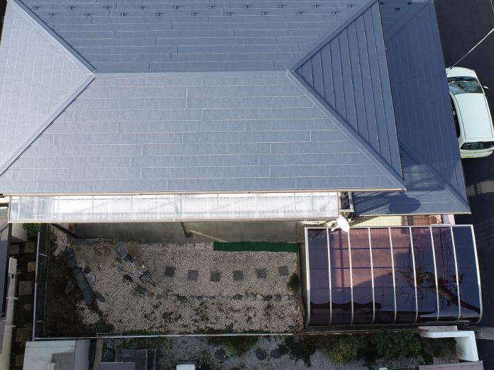 屋根のカバー工法リフォームです。あわせて雹害で破損してしまったベランダ屋根、カーポート屋根の張り替えです。屋根材は軽量・断熱効果のあるガルテクトです。既存の屋根の上から新しい屋根材をかぶせるカバー工法ですので、屋根材の撤去費用を抑えることができ、工期の短縮につながります。
