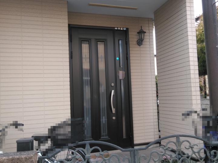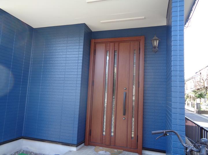 家の老朽化、住宅設備が古くなってしまったことをきっかけに、お問い合わせ頂きました。玄関ドア・外壁塗装・屋根カバー工法リフォームです。玄関ドアは、リクシル リシェント玄関ドア3断熱仕様で、冬は暖かく、夏は涼しくを可能にします。外壁の塗料は、超低汚染性・高耐候性・遮熱性・遮熱保持性に優れたアステックペイントのリファインを使用。色は、施工前とは、イメージをガラリと変えて、マウンテンブルーです。玄関ドアの木目調と組み合わさり素敵な仕上がりになりました。