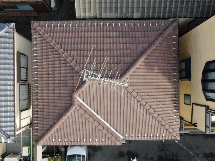 漆喰の劣化がきっかけでお声掛けいただきました。中古でご購入したため過去のメンテナンス状況が不明で、瓦の状態によっては葺き替えを視野に入れているとのことでした。点検をしたところお手入れはされていないようでした。劣化具合も考慮しまして、軽量な瓦材「ルーガ 鉄平」での葺き替えリフォームをご提案いたしました。「ルーガ鉄平」は、見た目は重厚な瓦そのものですが、重さは一般的な陶器瓦の約半分です。屋根が軽くなることで、地震の際の建物にかかる負担が軽減され、揺れが抑えられます。