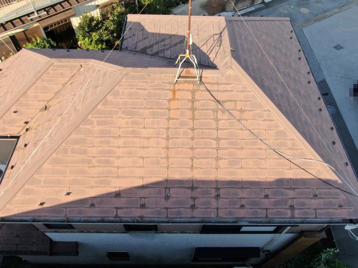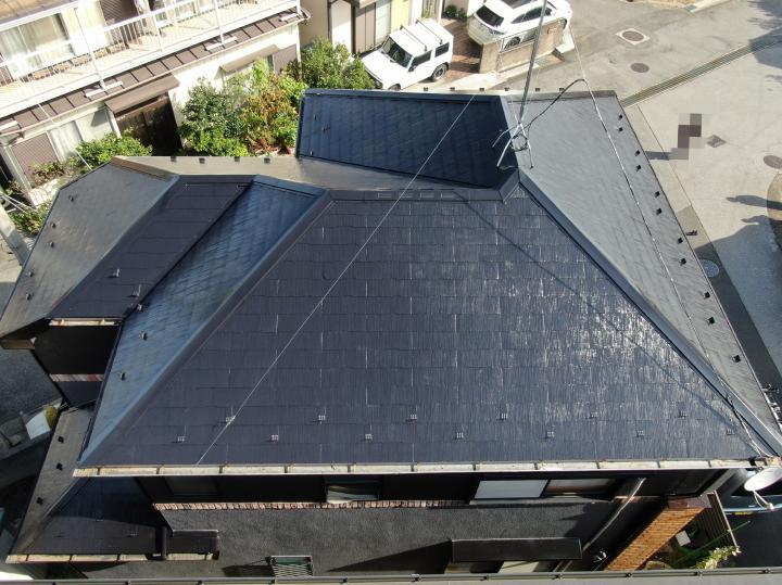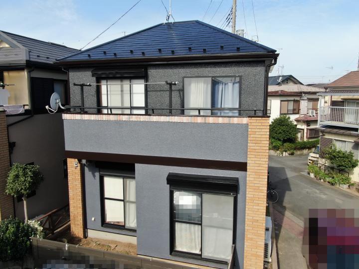 外壁塗装、屋根塗装リフォームです。外壁塗料は汚れに強く、長く美しさと遮熱効果を保つ高耐久な塗料アステックペイント超低汚染リファインを使用しました。屋根塗料は高い遮熱性を持ちあわせたアステックペイントのスーパーシャネツサーモを使用しました。ブラウン系のナチュラルなイメージから、屋根色はブラック系へ、外壁色はグレー系に塗り替えられ、モダンな洗練された印象になりました。