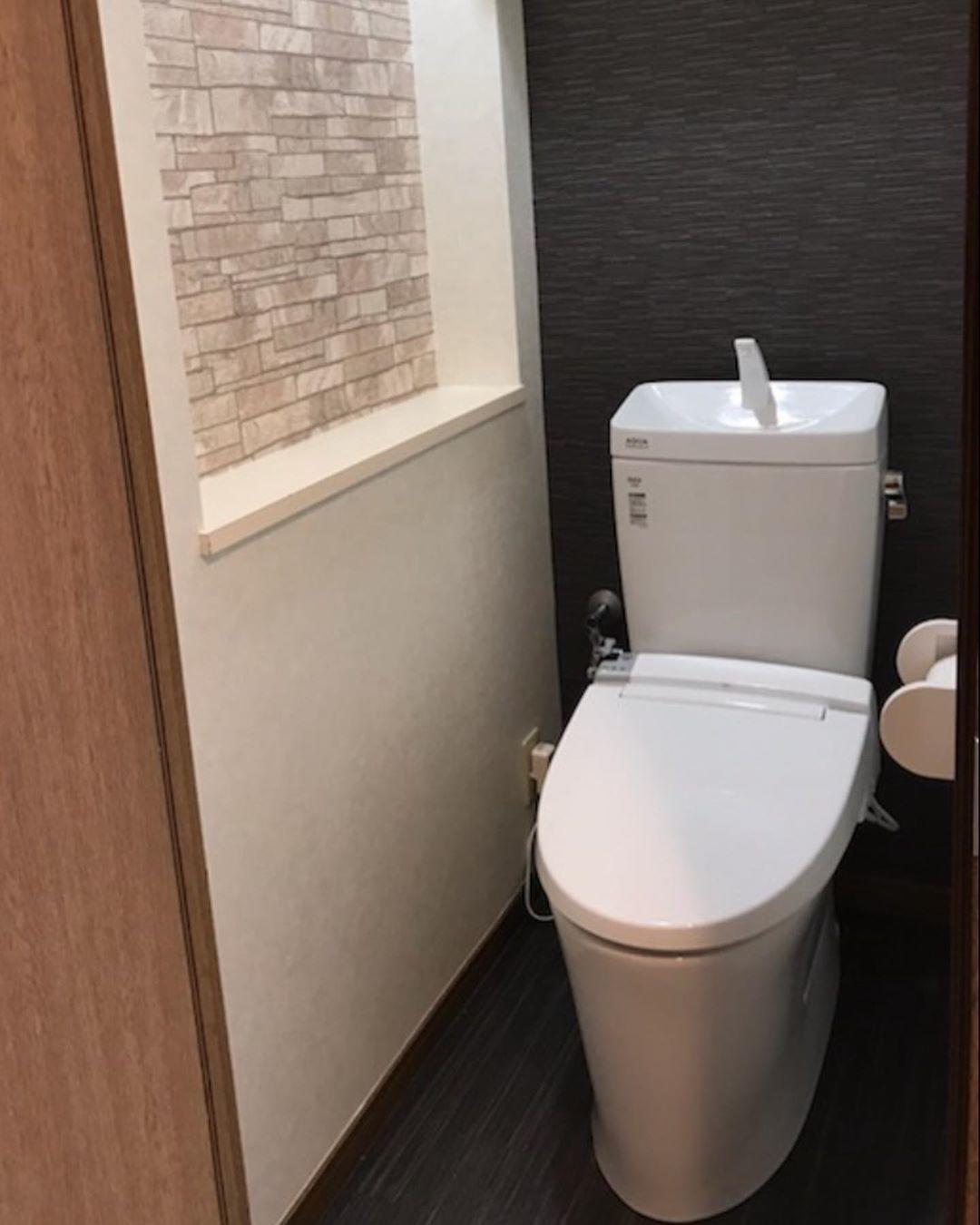 トイレの便座の水漏れが今回の工事のきっかけでした。 トイレ本体はお掃除がしやすく、リモコンで操作が可能な機種をお選び頂きました。 内装も大幅なイメージチェンジをしたいとの事で、壁紙は背面・ニッチにアクセントクロスをお選び頂きました。 色合いも落ち着いていて、素敵な空間に仕上がりました。