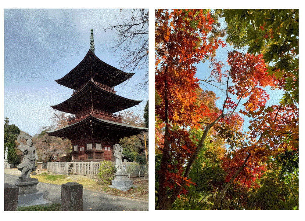 春、桜の花に埋もれる三重塔も今はひっそりですが、カエデ・紅葉専門の植木屋さんはTVの影響でこの時期は大混雑。