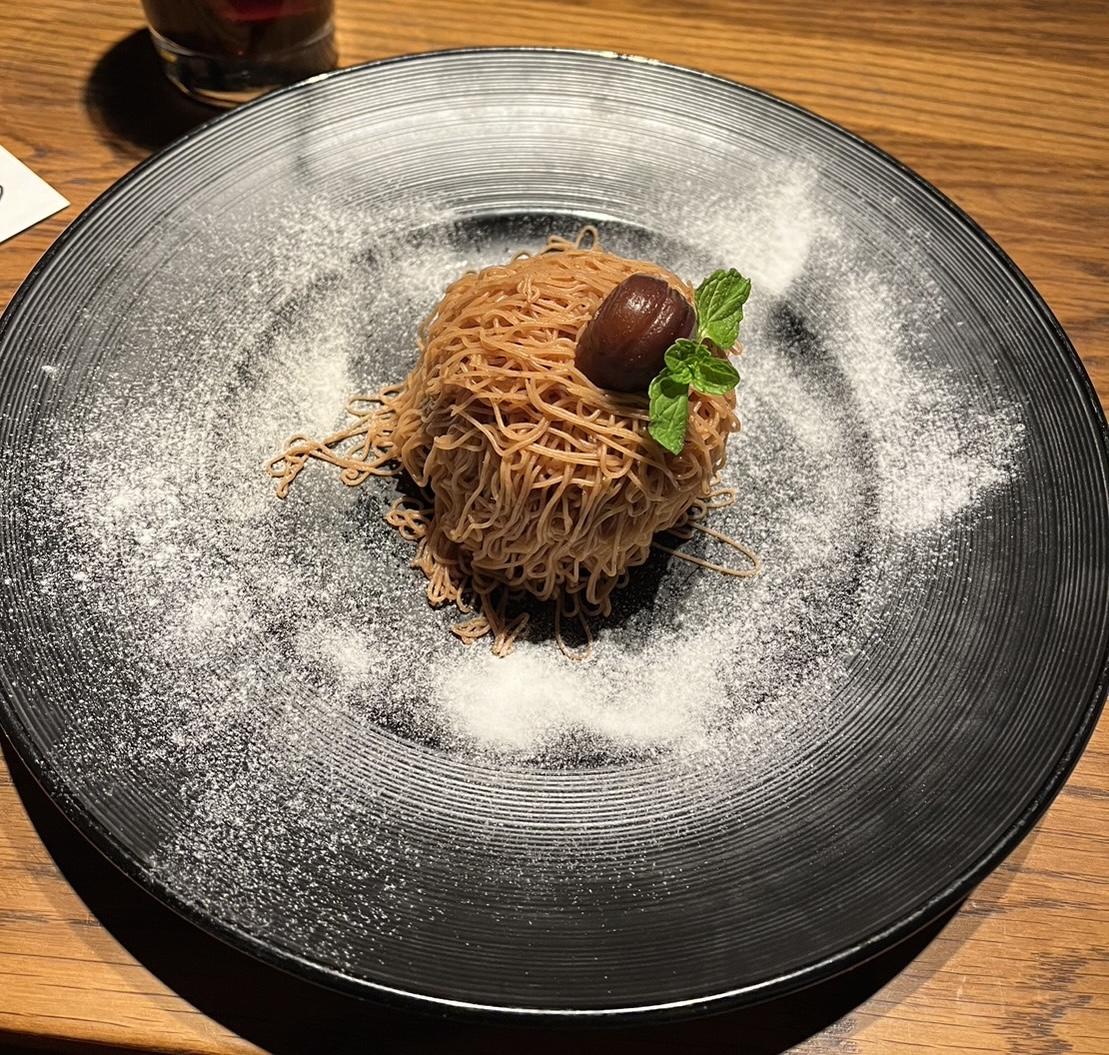 食事を楽しんだあとに、デザートとしてモンブランをいただきました。かなりお腹はいっぱいだったのですが、クリームは軽い口当たりで、生地もほどよい甘さだったのでぺろりと食べられました。久しぶりにモンブランを食べましたが、やっぱりモンブランが一番だと再確認しました...![]()
