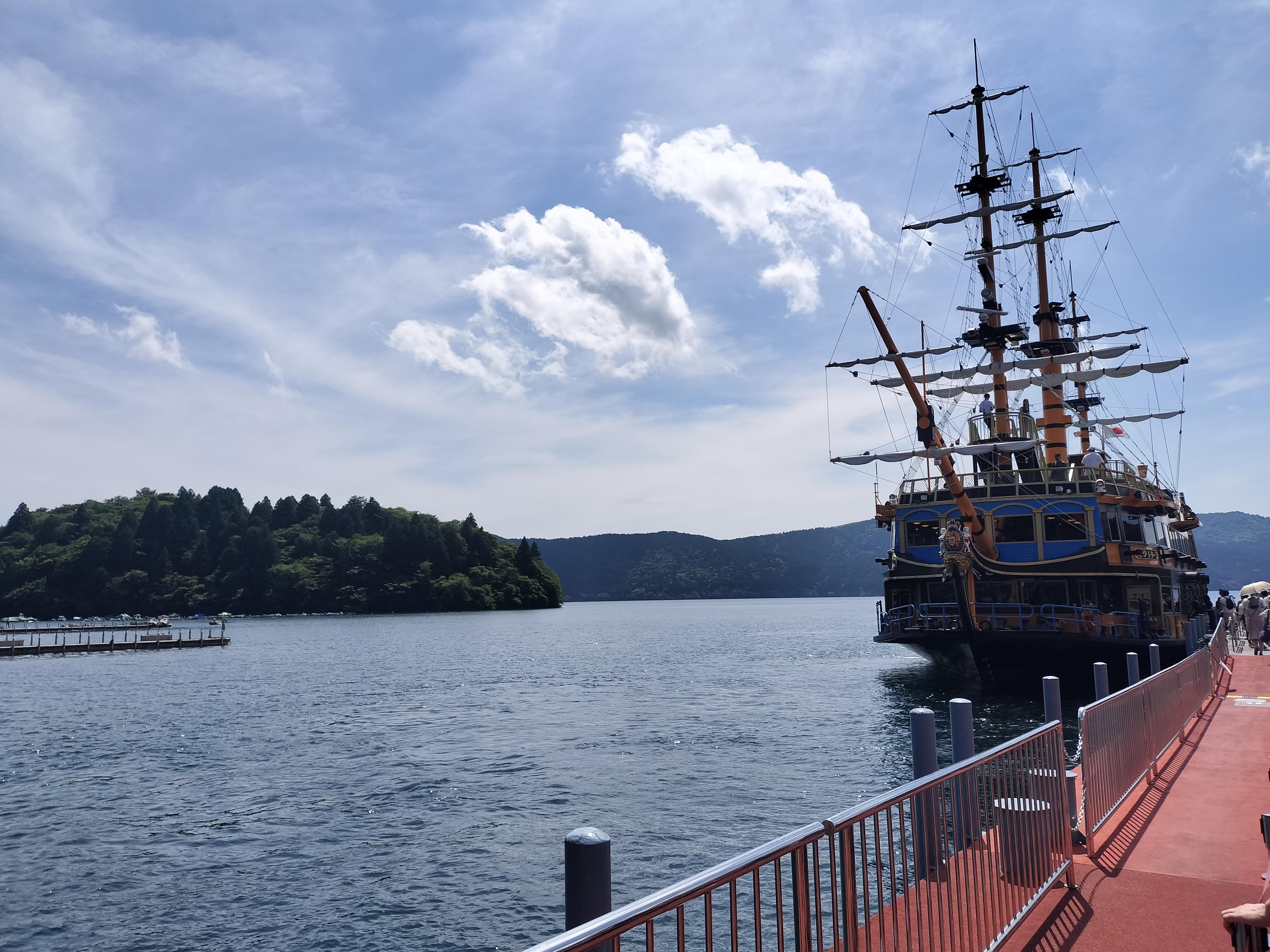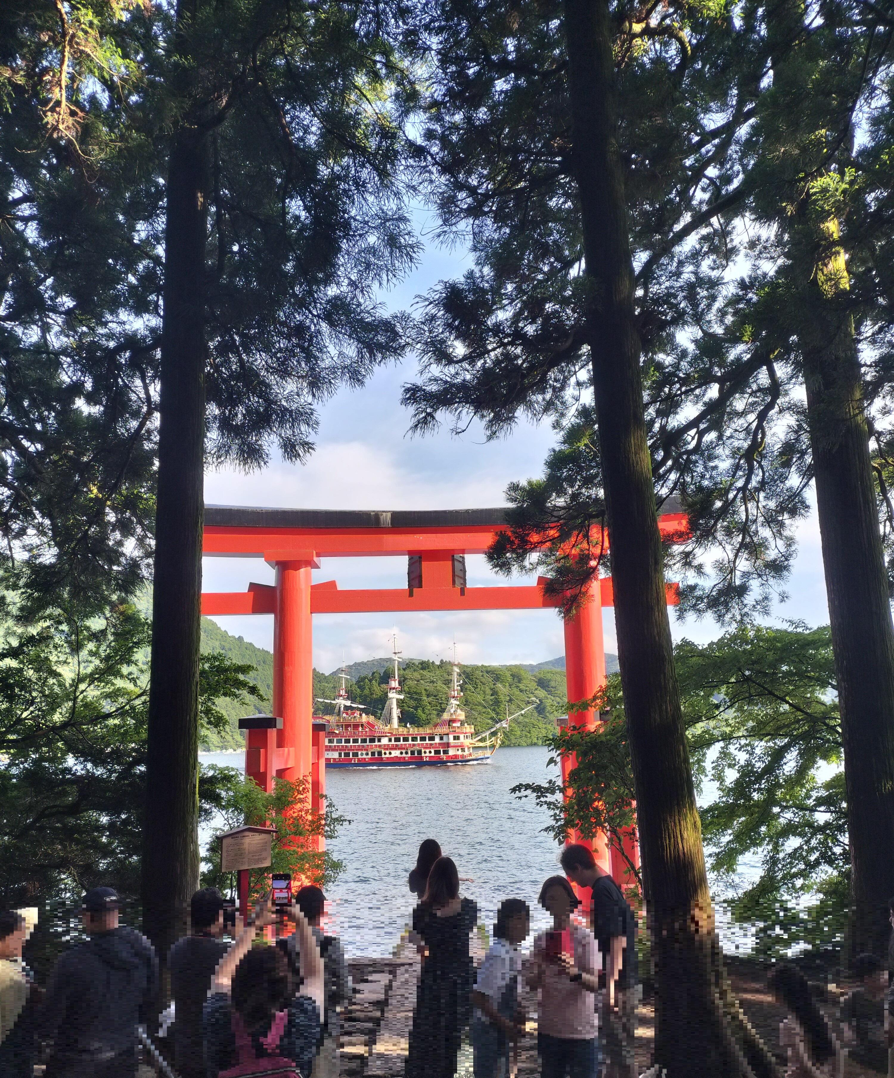 遊覧船に乗って芦ノ湖を周遊。青空が広がり、日差しは強かったですが、風が気持ちよかったです。港のそばにある箱根神社に参拝しました。