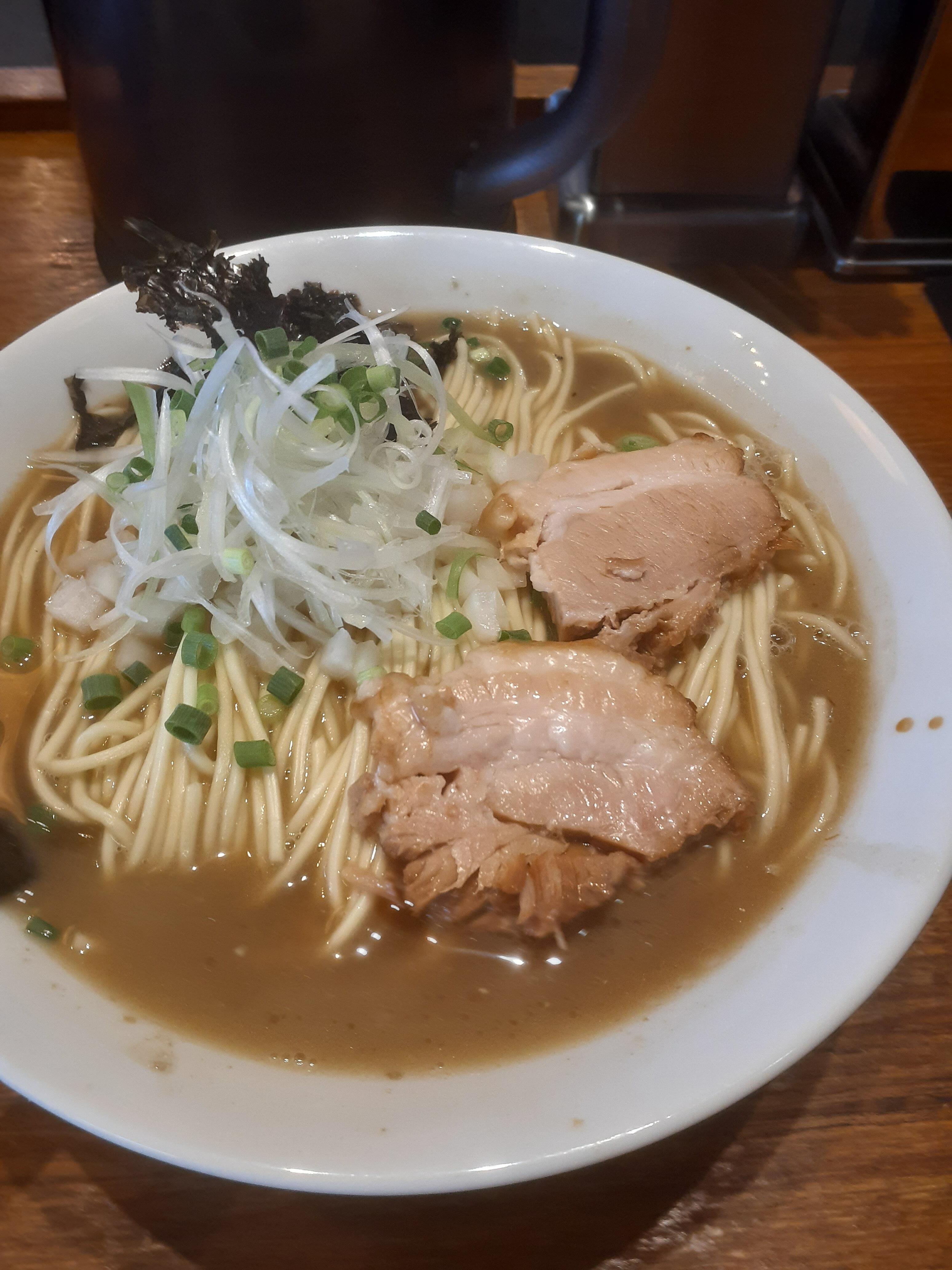 店名は伏せますが、煮干ラーメンで有名なお店です。いつもは行列で諦めていましたが、混雑がなく入店できました。