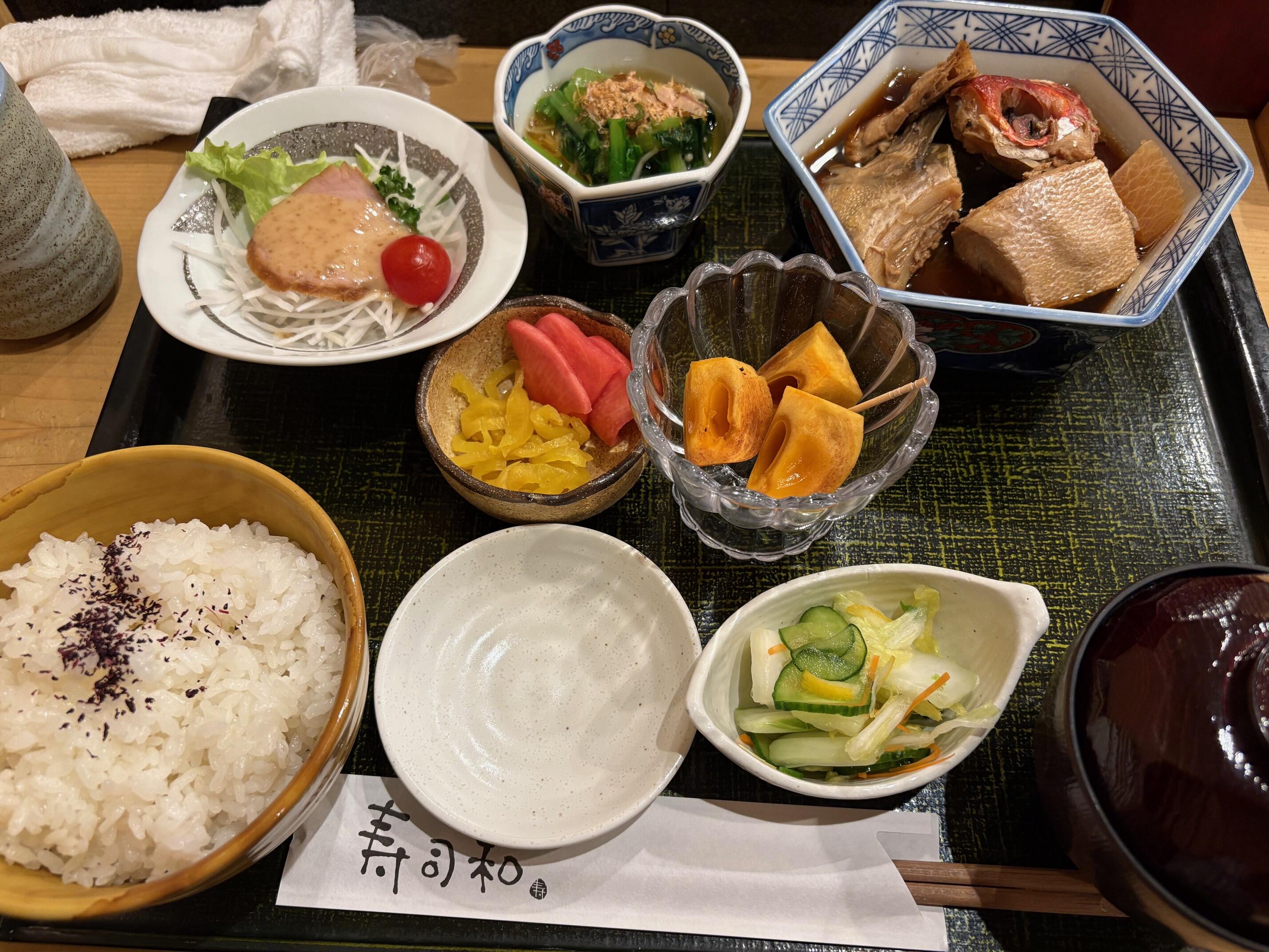 こんにちは、西崎です。ダイエットをはじめて1年経ちました。会社の近くにあるここはお寿司屋さんなので普段は行かないんですが、たまにはということであら煮定食を食べてみました。もちろんご飯は半分にして、健康に気を使いながら久々に豪華な食事をいただきました。