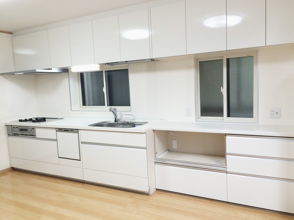 ワンちゃんが亡くなり、いた頃に傷ついたフローリングを貼り替えると同時にキッチンの交換もされたいというご依頼でした。白を基調とした明るいキッチンに生まれ変わり、お客様も大変喜んでおられました。