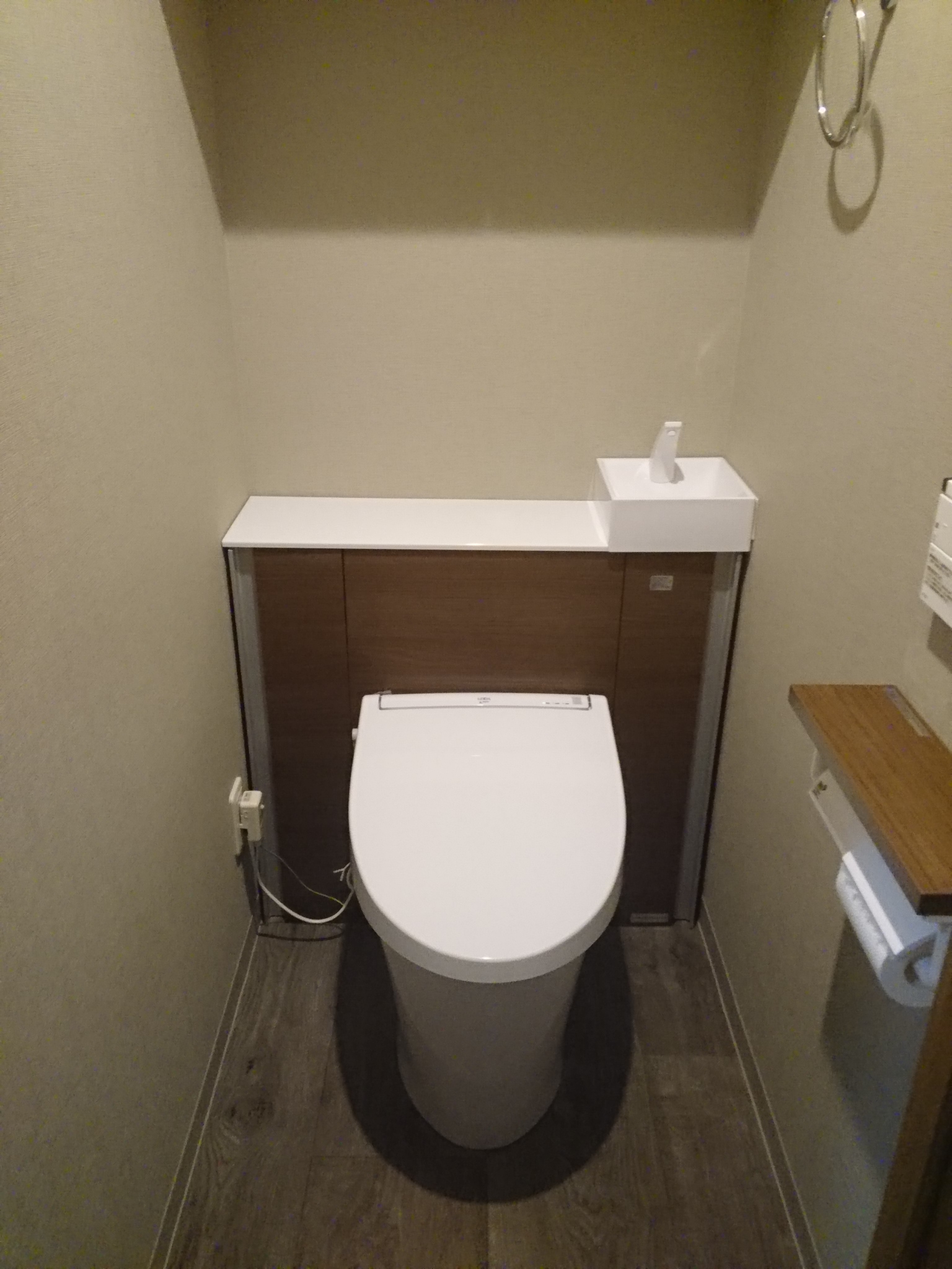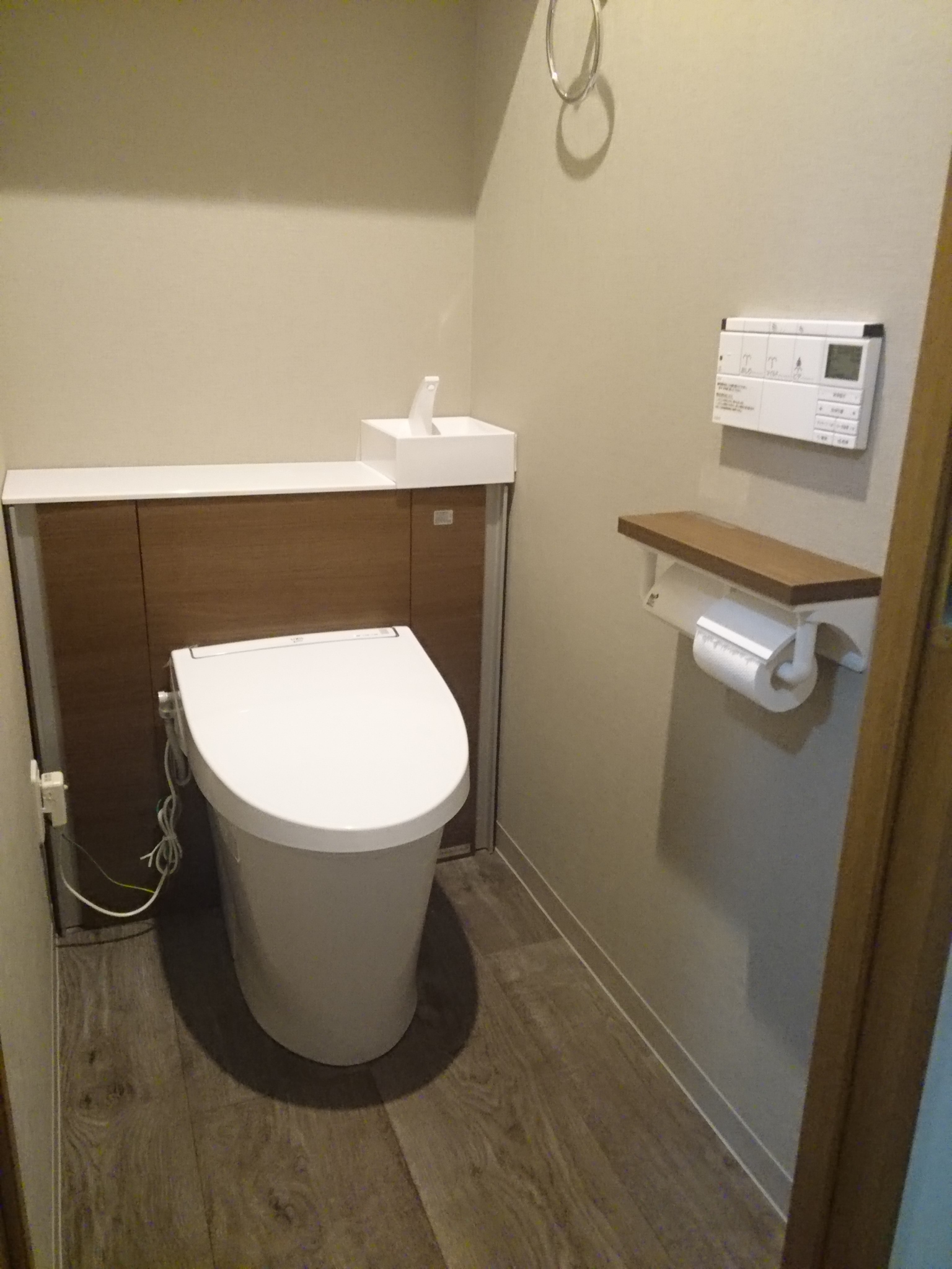 今回のご依頼は、お客様が行ったお店で見た雰囲気のあるトイレにしたいといったご希望でした。LIXIL製品ではキャビネット付きのリフォレがご希望に一番マッチしていたので、壁紙や床などの内装も合わせて工事させていただきました。同時にエコカラットなどを壁に貼ると匂いなども吸着してくれるのでより快適なトイレ空間になるかもしれませんね。