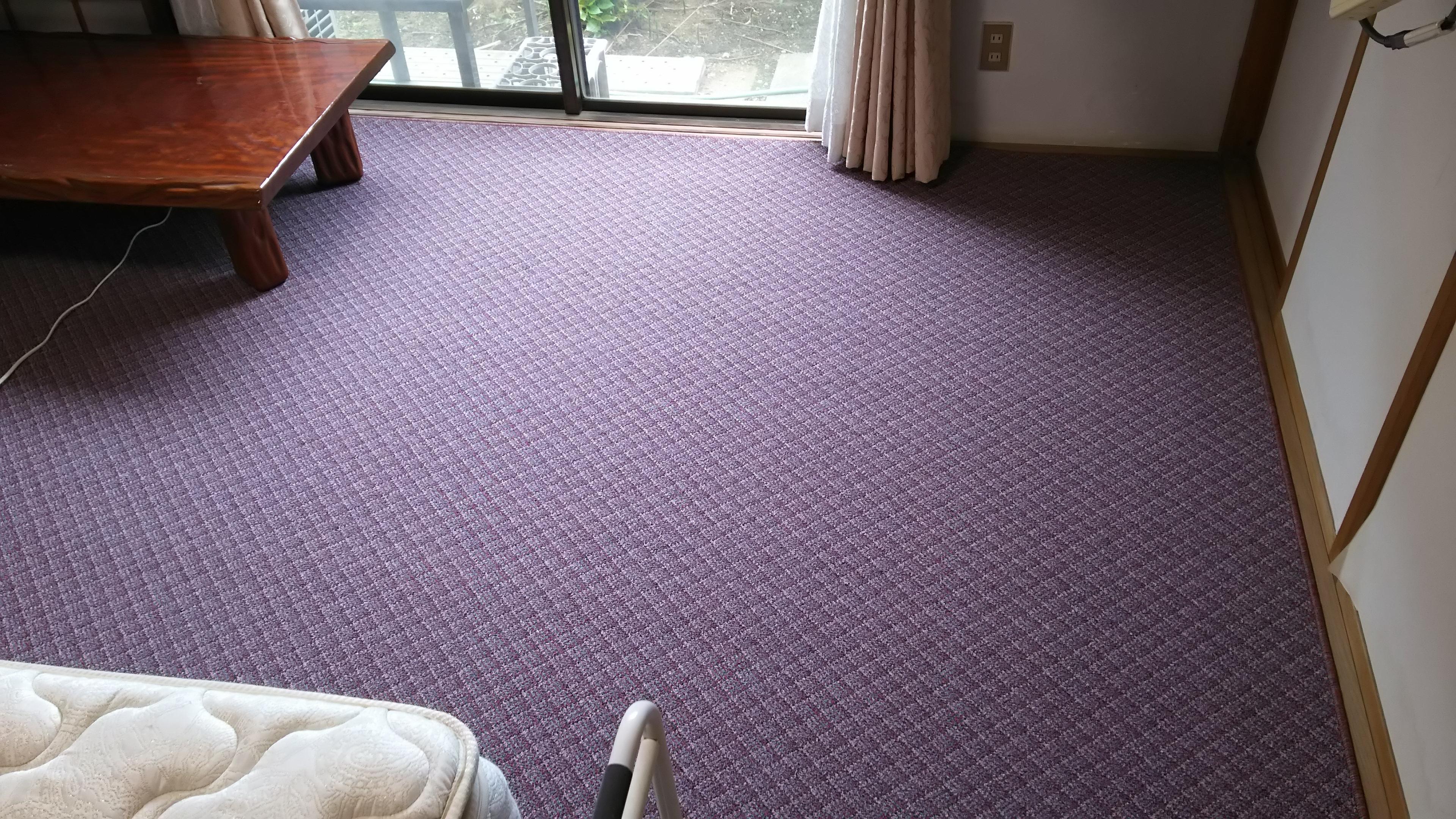 家事代行サービスでお世話になっているお客様です。フローリングが寒くてスリッパを履くのが面倒だと、マットを敷き詰めていらっしゃいましたが、大きなカーペットを敷きたいとご依頼をいただきました。10帖のお部屋が素敵なカーペット敷きになり、すっきりいたしました。このほか、トイレ・洗面所のCF張替もさせていただきました。