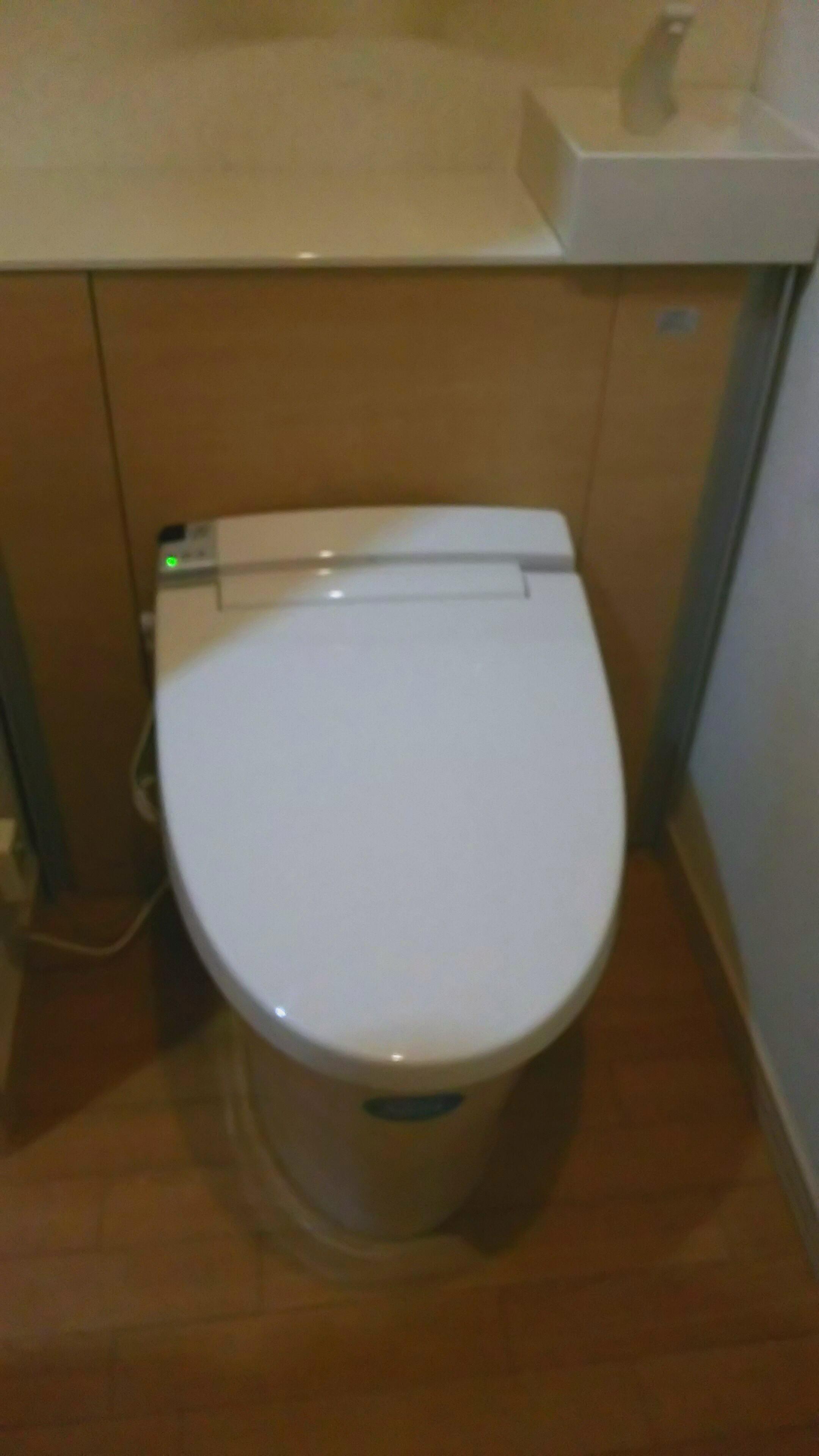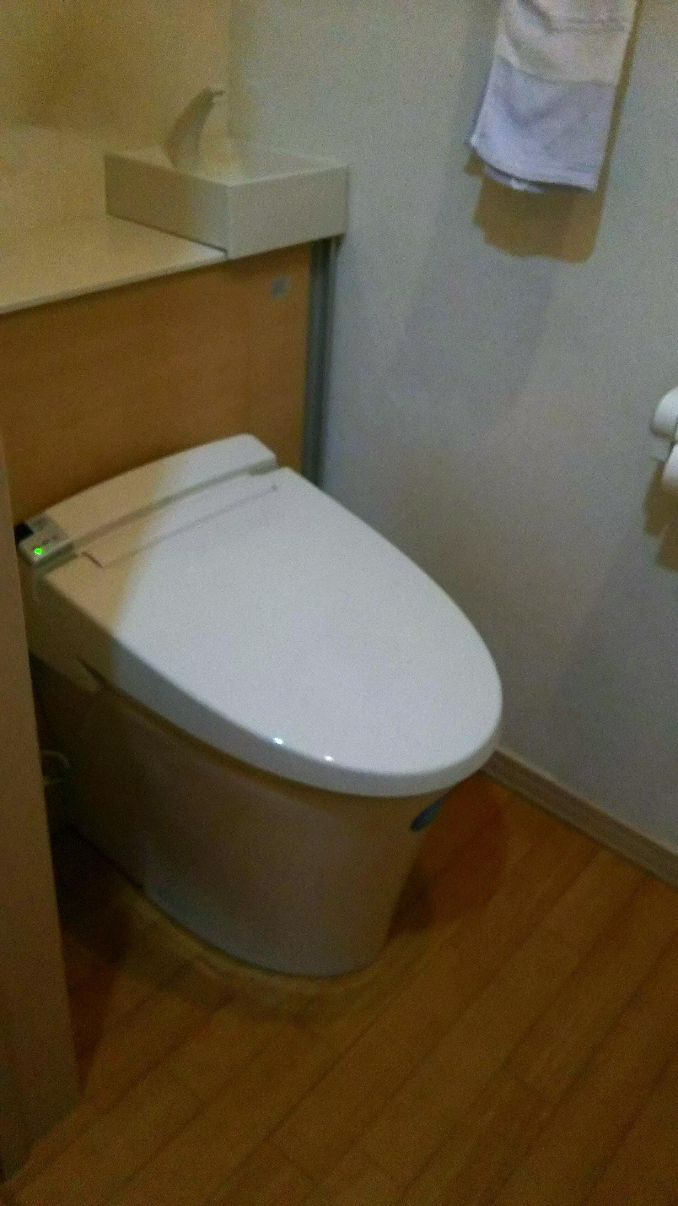 十数年経っていて、どこからか水漏れがしているようで床が濡れるとご連絡いただきました。便器下の配管からの水漏れでした。イメージも少し変えたいとのご希望でしたので、手洗い付きの収納にタンクも隠れスッキリと収まるリフォレをご提案いたしました。施工後、「いいわね!良かった、ありがとうございました。」と喜んでいただき、私共も笑顔になれました。