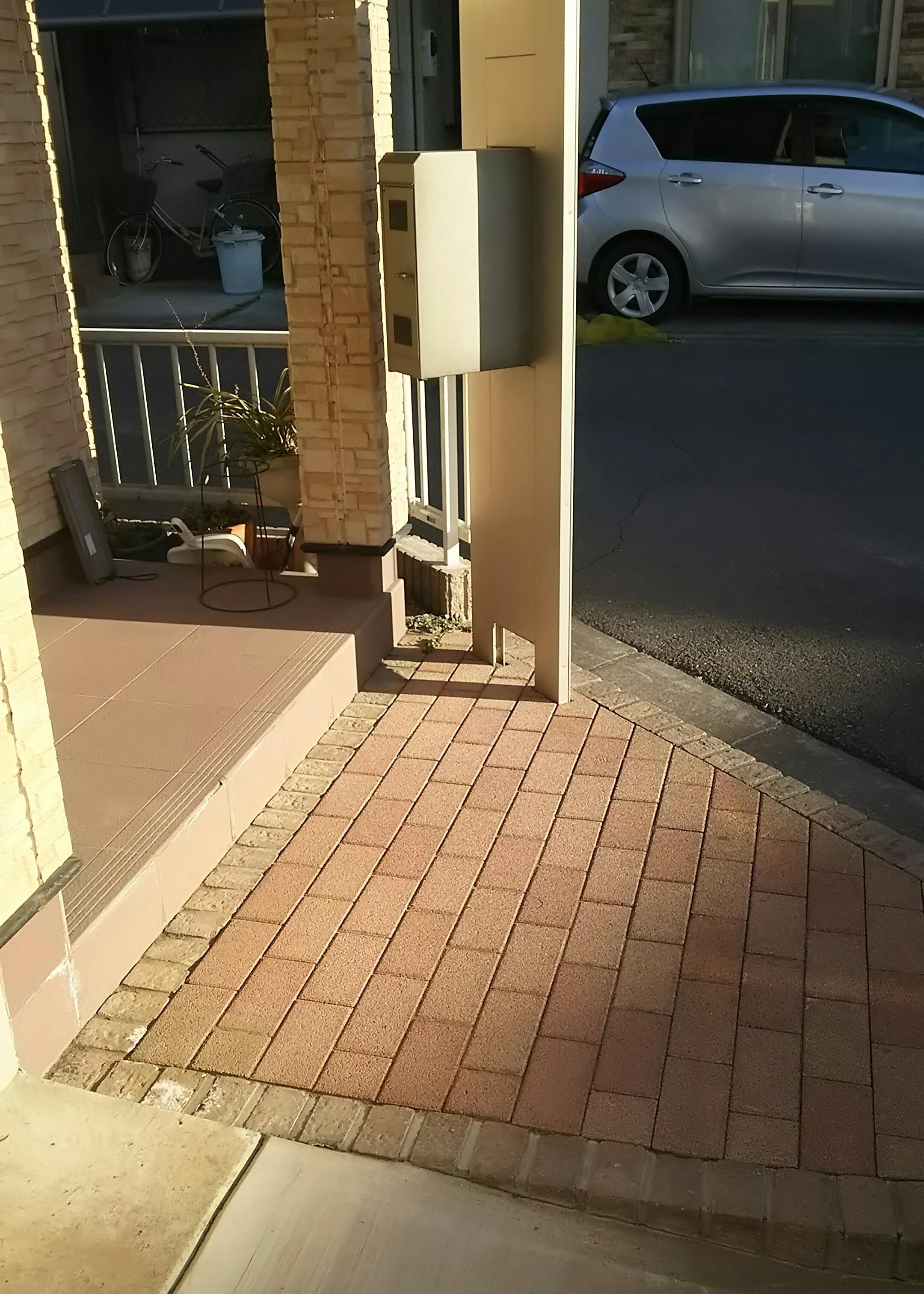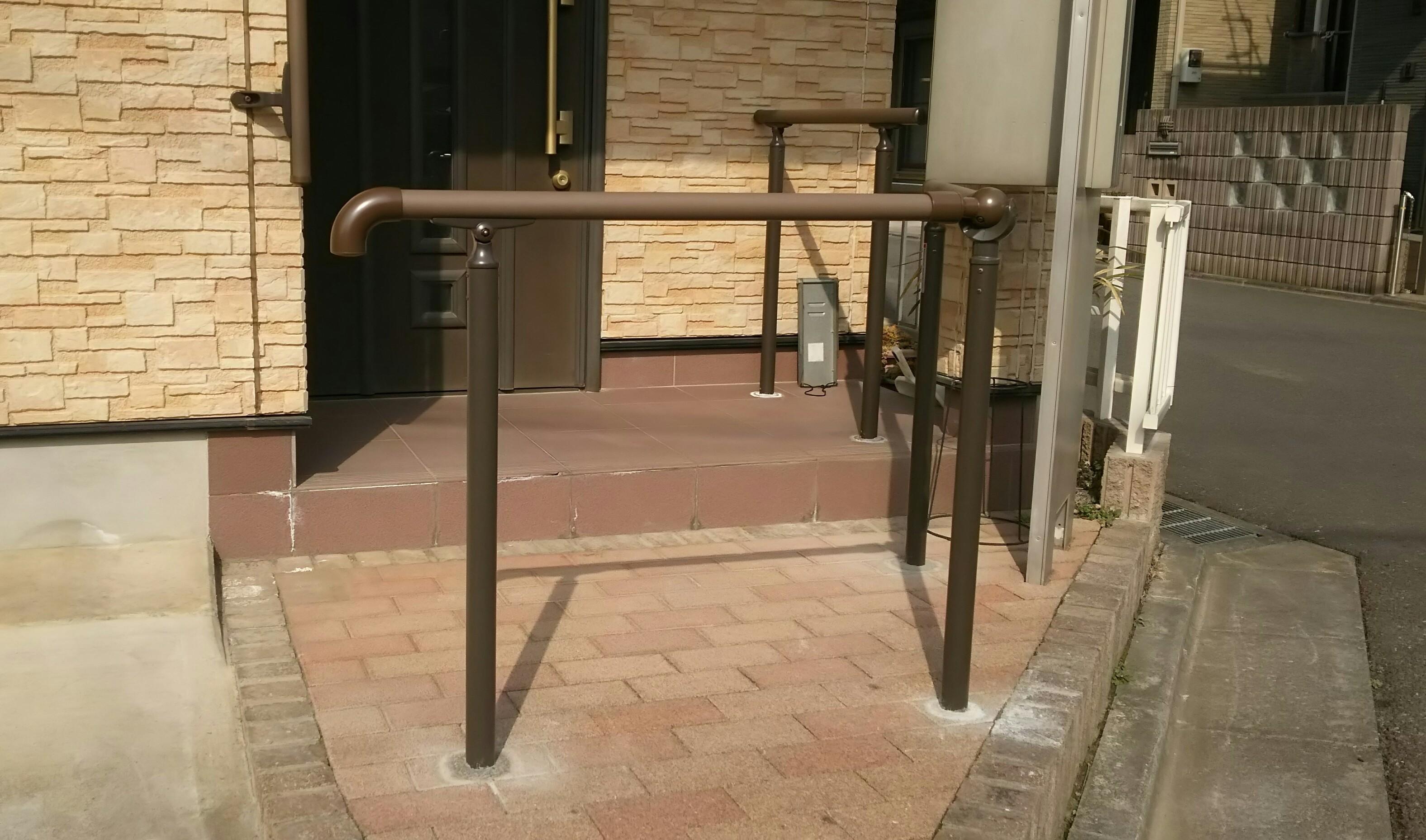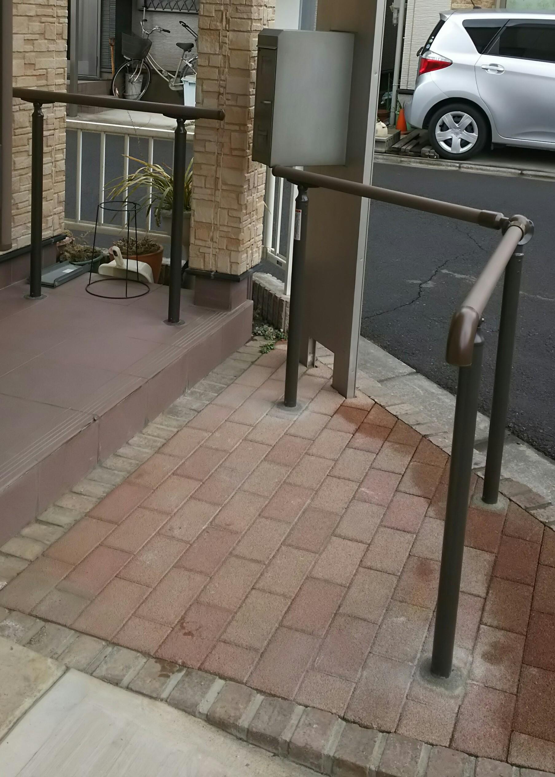 退院してくるお母様のために「玄関前に屋外手すりをつけたい」と息子様からご依頼いただきました。段差があるため、手すりの高さを慎重に考え、昇る時・降りる時など何度もイメージしながら設置いたしました。手すりは明るい色にすることが多いのですが、とても陽当たりの良いお宅でしたので、玄関ドアと同じダークブラウンを使い、違和感のないように仕上げました。また、今までは20cmほどの段差も軽々と昇り降りしていたようですが、高齢者の段差の転倒は降りる時が圧倒的に多いため、段差の少ないルートでの出入りをしていただくよう、手すりを配置いたしました。介護介護した雰囲気にならないようにすっきりまとめました。完成してから、息子様に少し離れた所から見ていただきましたら、「うんうんうん」と笑顔でうなづいてくださいました。設置するだけでなく、お客様の状態やご希望をしっかりと受け止め、ご満足いただけますよう、これからも対応して参ります。