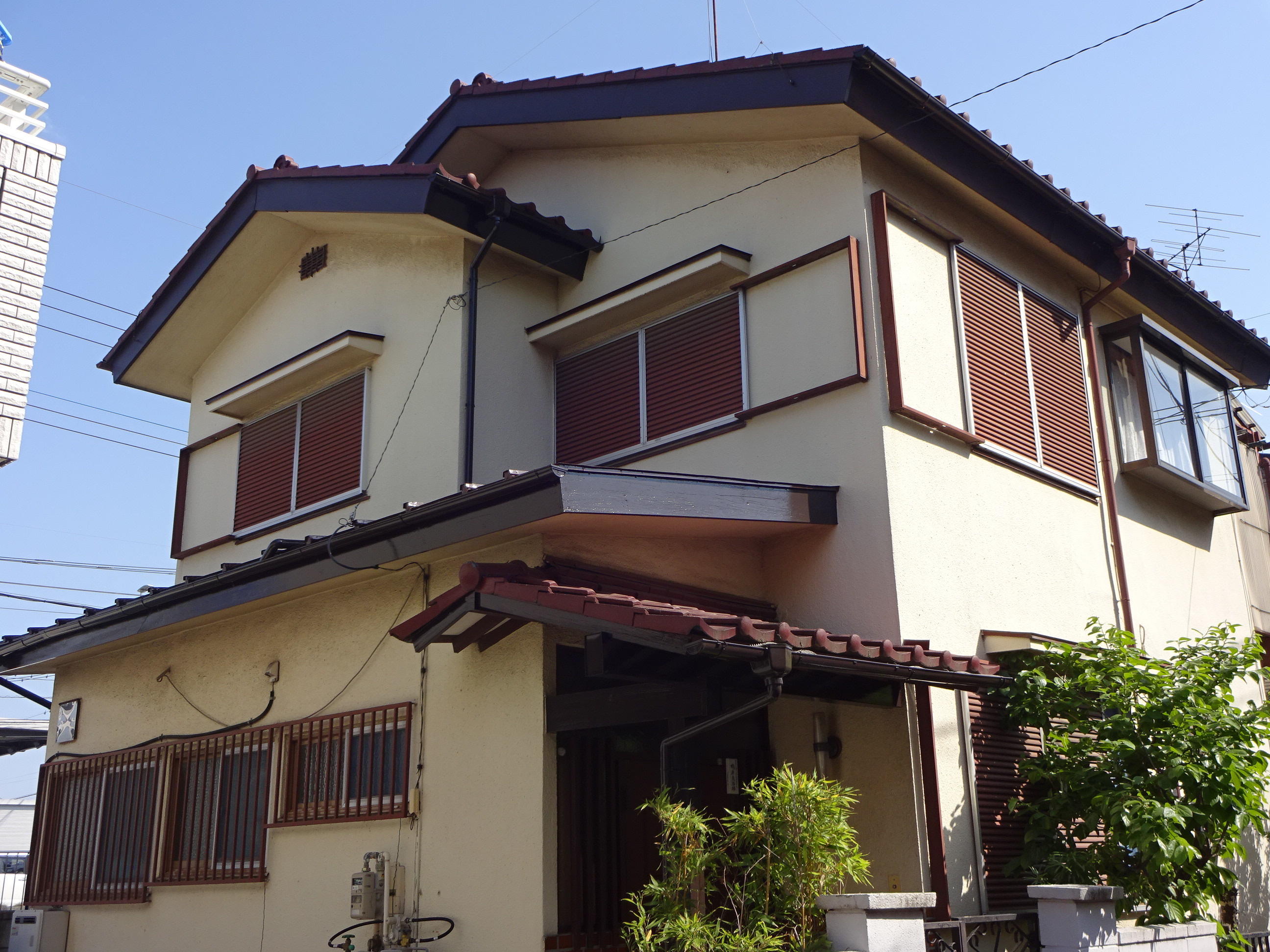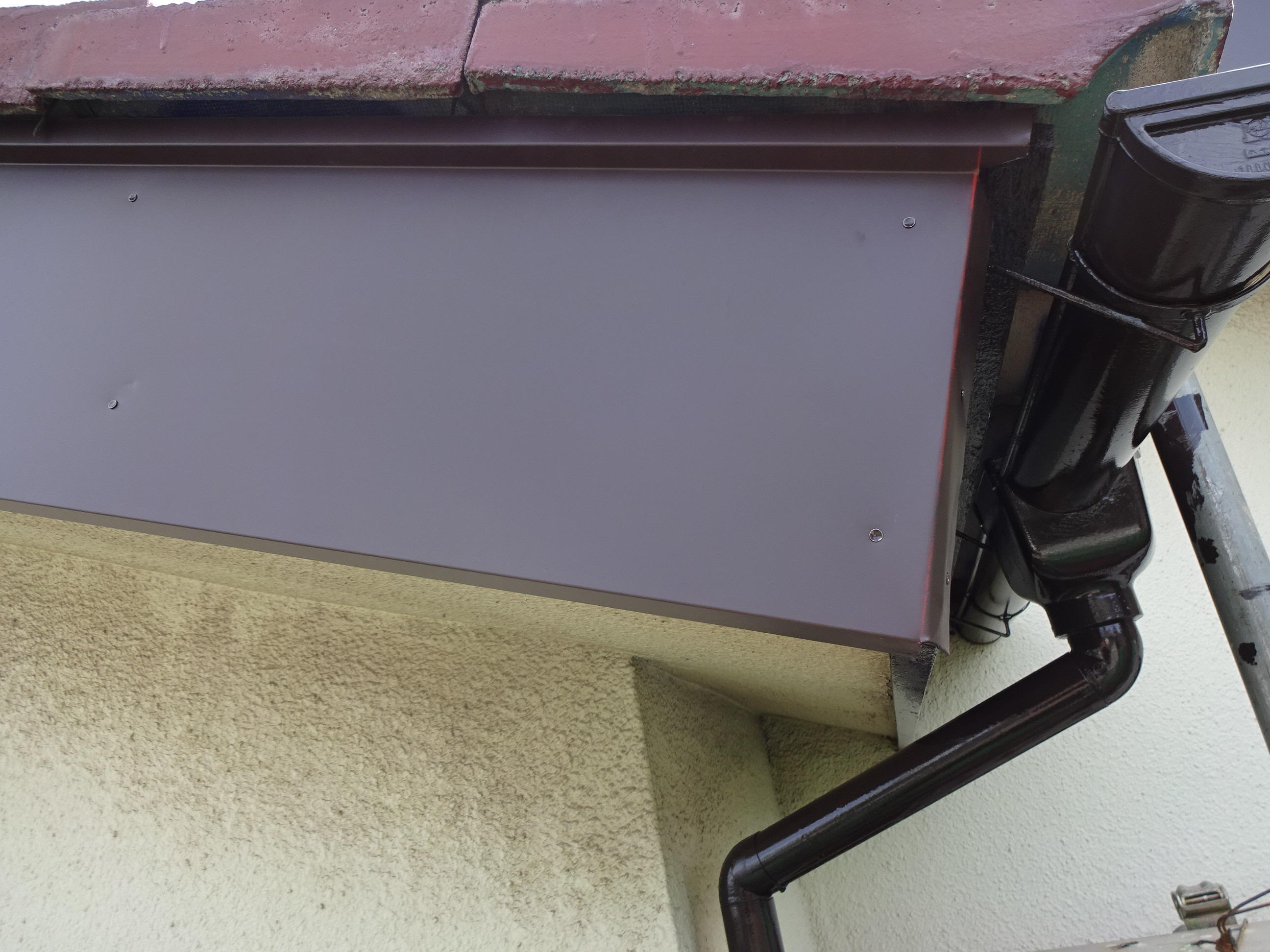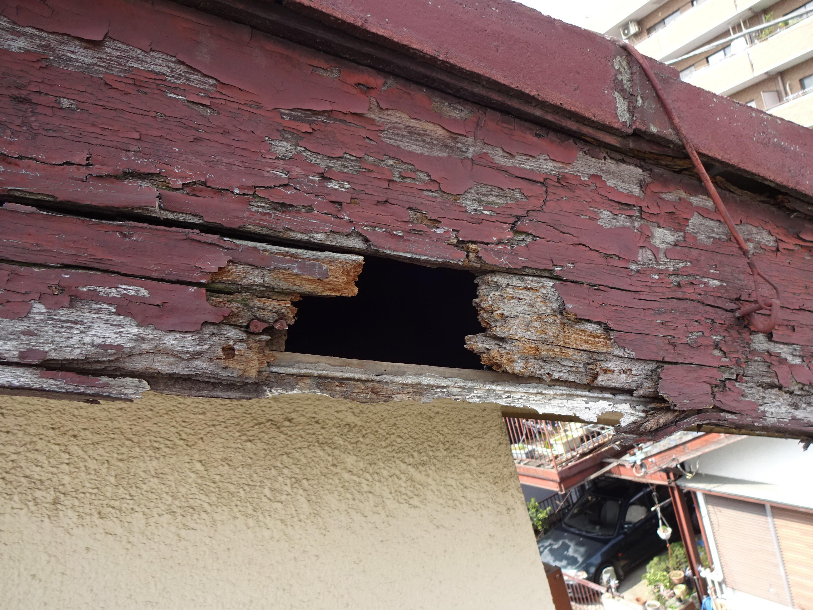 今回破風部分の板金工事と、せっかく足場をかけるので屋根の雨樋、破風の木部などを塗装させていただきました。 ごみを捨てに外に出ると、板の破片が落ちていたので見上げてみると屋根の破風部分にぽっかり穴が開いたそうです。 直径15cmくらいの穴だったので鳥や虫が入ってしまったり、雨が吹き込んだら大変。 毎月ポストに入っている、弊社の『エコキレ通信』を思い出しお電話くださいました。 早速伺ってみると下から見てもわかる穴でした。 確認させていただいた2日後に大雨の予報も出ていたので、ひとまず吹き込まないように翌日に板で塞ぎ応急処置。 その後にいくつかご提案をさせていただきました。 応急処置をさせていただいた時に木の芯がボロボロになってしまっているのを確認していたので、一部の補修は難しく 木の交換か、上から板金を巻くかの2パターンの提案となりました。 お客様は後々には屋根も考えているということでしたので、解体などはせずに板金で巻きこむ方法でのお話になりました。 ご契約いただいたのが4月中旬でしたのでゴールデンウィークを跨がないように、早急に段取りしました。 天気にも恵まれ、ゴールデンウイーク前に完了することができました。 見えない屋根の部分の塗装などもお写真を撮ってお引渡しの際に確認いただきました。 ご自分ではなかなかできないお家の点検、心配な方や気になる方はお気軽にご連絡ください。