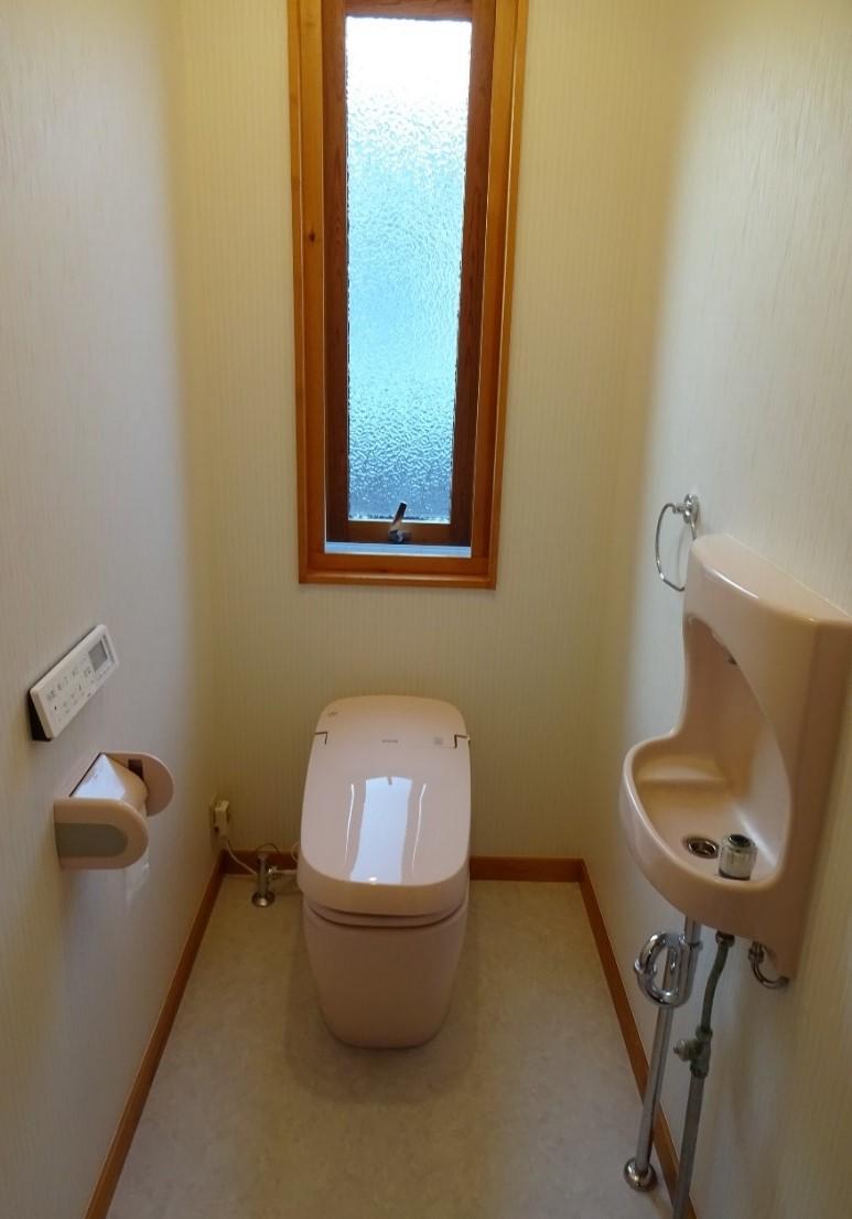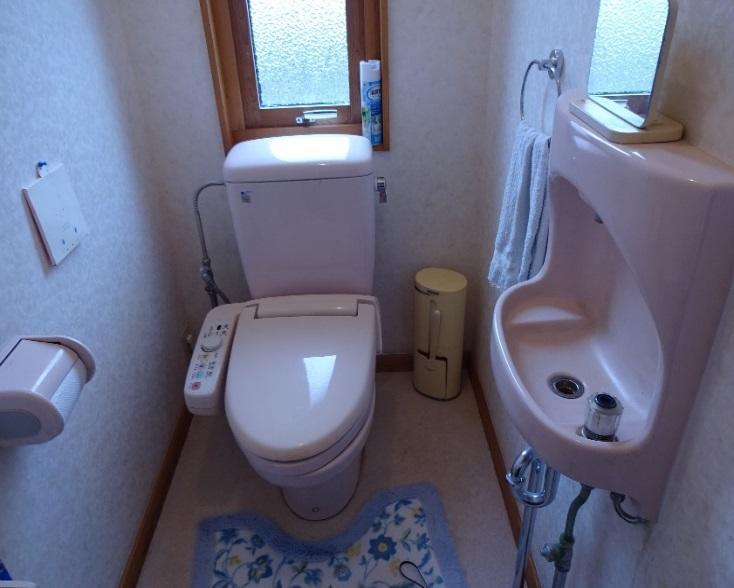 トイレの交換と、内装工事をさせていただきました。 タンクの調子が悪く、タンクへの給水が止まらなくなってしまっていました。 お客様が、ご自分でいろいろなメーカーのトイレを研究に研究を重ねて今回お選びいただきましたのが『サティスG6』! 旦那様は『泡クッション』奥様は『リフトアップ機能』でお掃除が楽という点が大きかったそうです! 手洗いは再利用させていただきましたので、トイレの色もピンクに合わせました。 トイレを交換した場合、今のトイレよりも小さくなる場合があります。 床がクッションフロアの場合は跡がでますので張替えをお勧めしています。 今回は床だけでなく、天井と壁のクロス張替えもさせていただきました。 柄は少しラメが入っていてお洒落なチョイスです☆ 工事が終わって操作説明とお手入れ説明をさせていただきました。 色々機能がついていますが、普段使う機能だけをまとめた冊子もついていたのでわかりやすいです。 タンクが無くなったことでスッキリとし、内装も変えてとっても明るくなりました。 節水タイプなのでお財布にも環境にもやさしいトイレになりました。