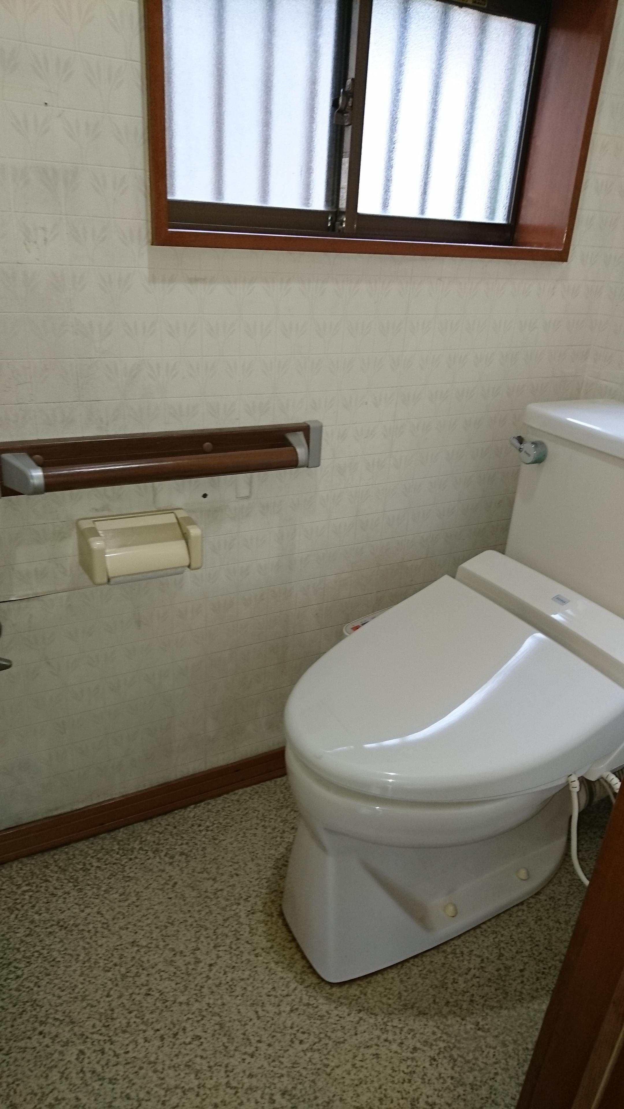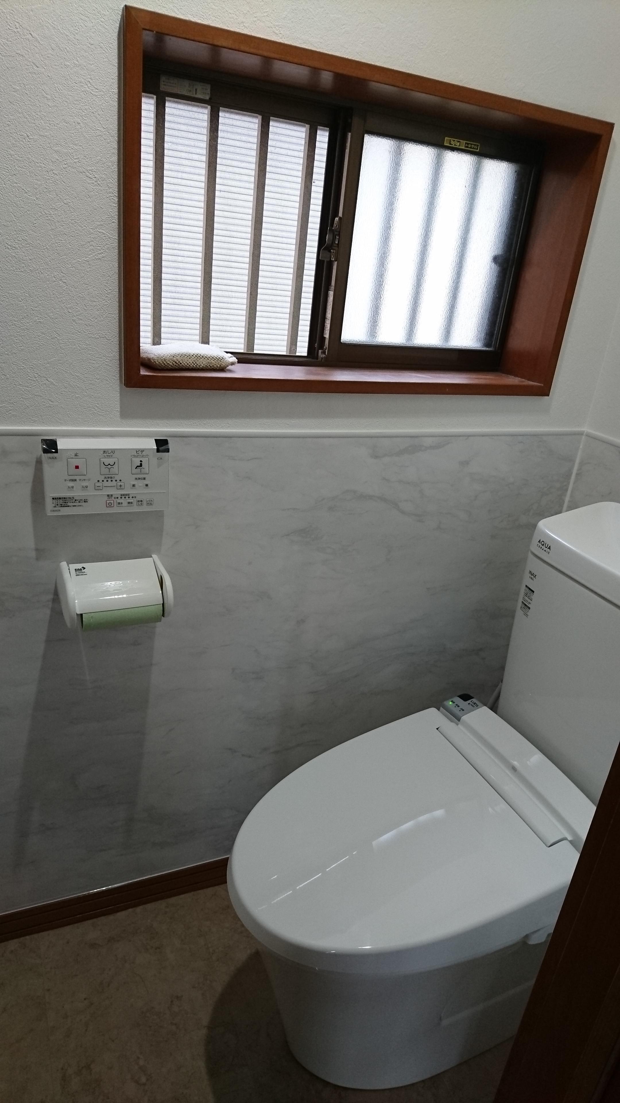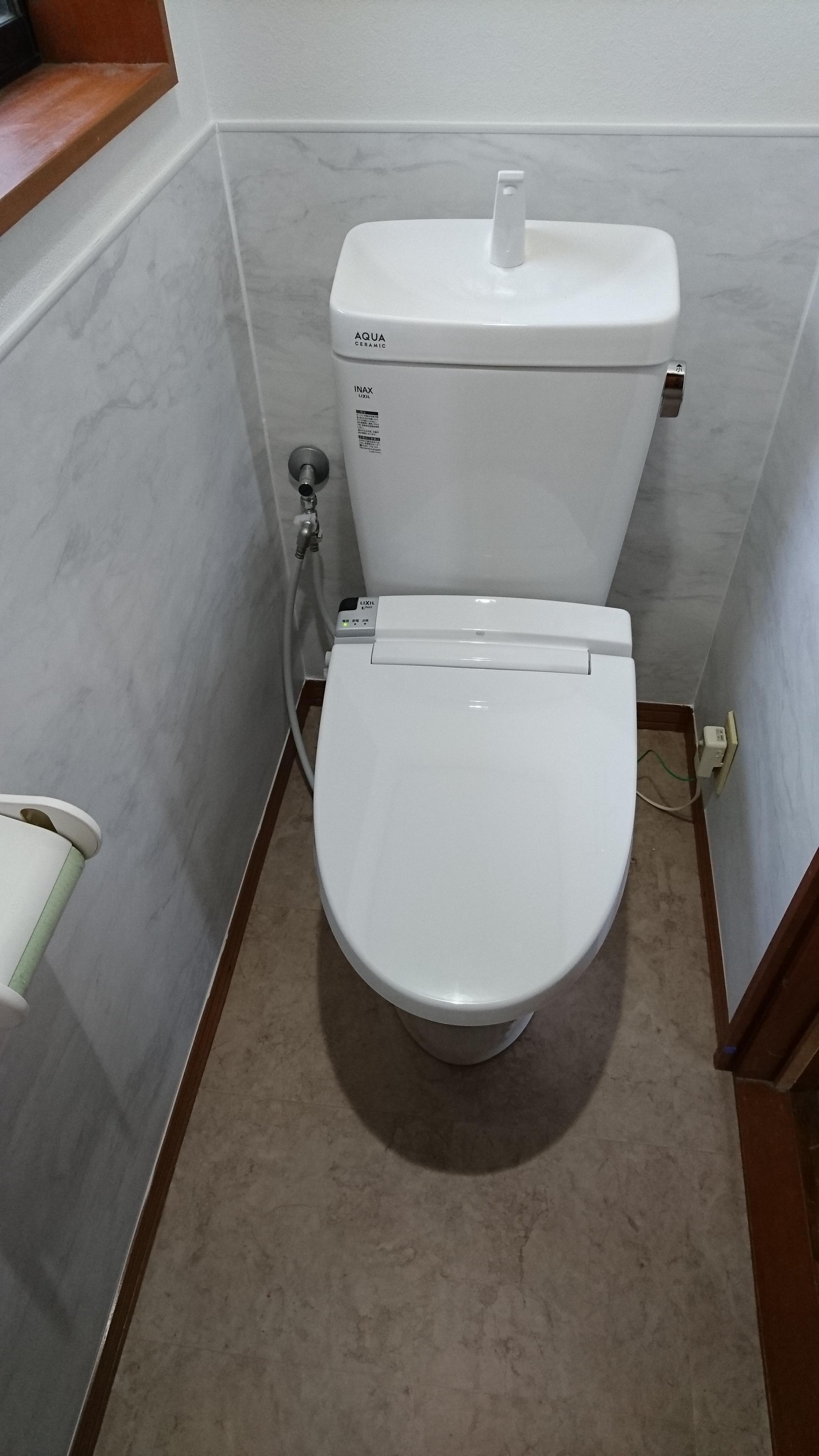 1日工事のPATTOリフォームでトイレ工事をさせていただきました。 築40年くらいのお宅でした。 ウォシュレットの調子が悪くご連絡いただきました。 今のトイレは節水になっていてお掃除も簡単だというCMを見ましたとおっしゃっていました。 その頃のトイレは(大)を流すと15Lくらい必要でしたが、今回のトイレは5Lなので水道の使用量が1/3になります! そして、清掃性一押しののコーティング『アクアセラミック』仕様のトイレを付けさせていただきました。 新品時のツルツルが100年続くというお掃除簡単♪な商品です。 更にフチレストイレなのでお掃除がラクチン♪ 今回はさらに清掃性にこだわりました! トイレの壁の腰くらいまでの部分は汚れが飛びやすいですね・・・。 そこで!腰の高さまで壁紙ではなく、サニタリー用パネルを貼りました。 汚れもふき取りやすく、見た目もお洒落です。 あまり使われていなかった手洗い器も外して、トイレ全体的に広く明るくなりました。