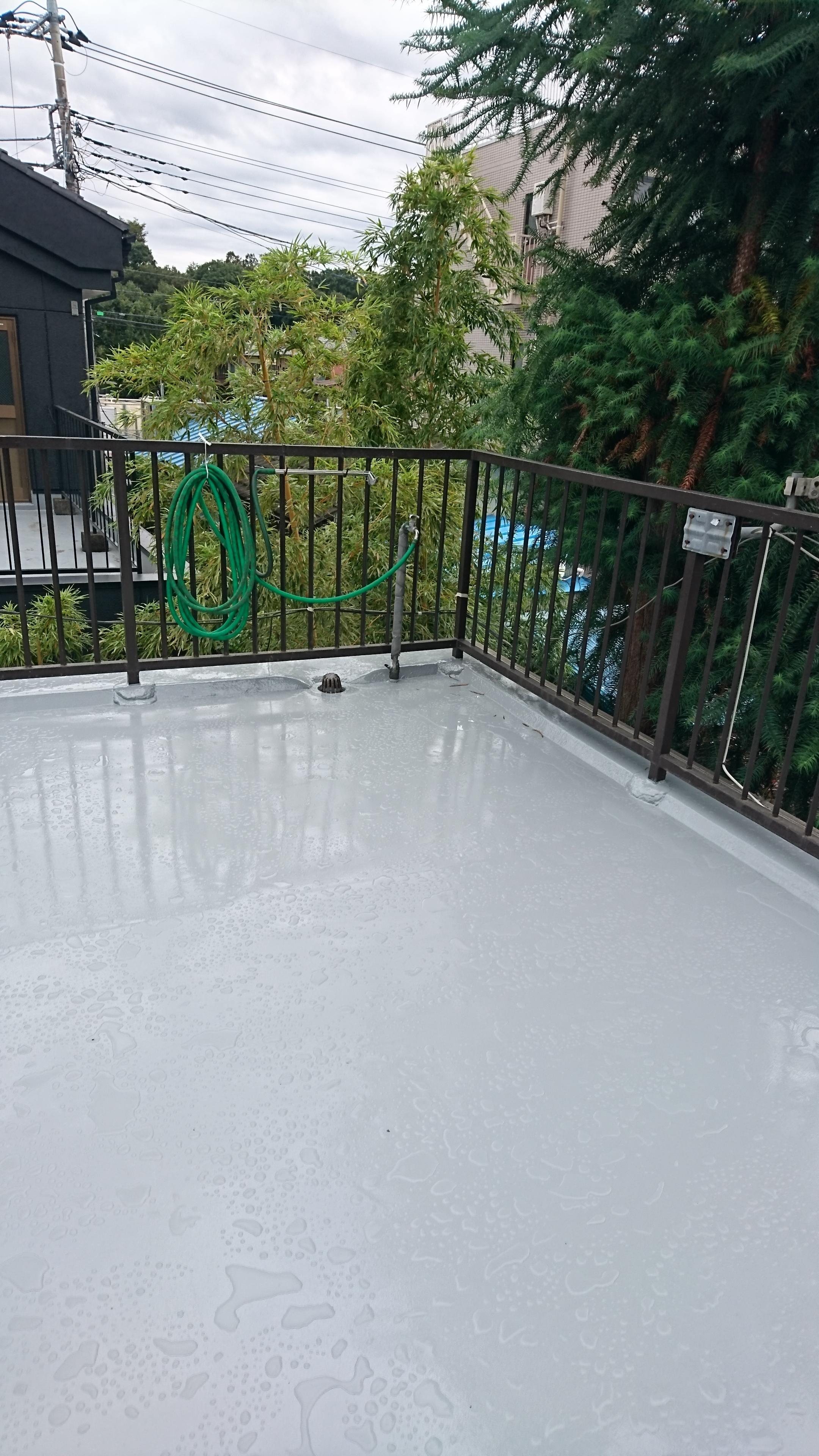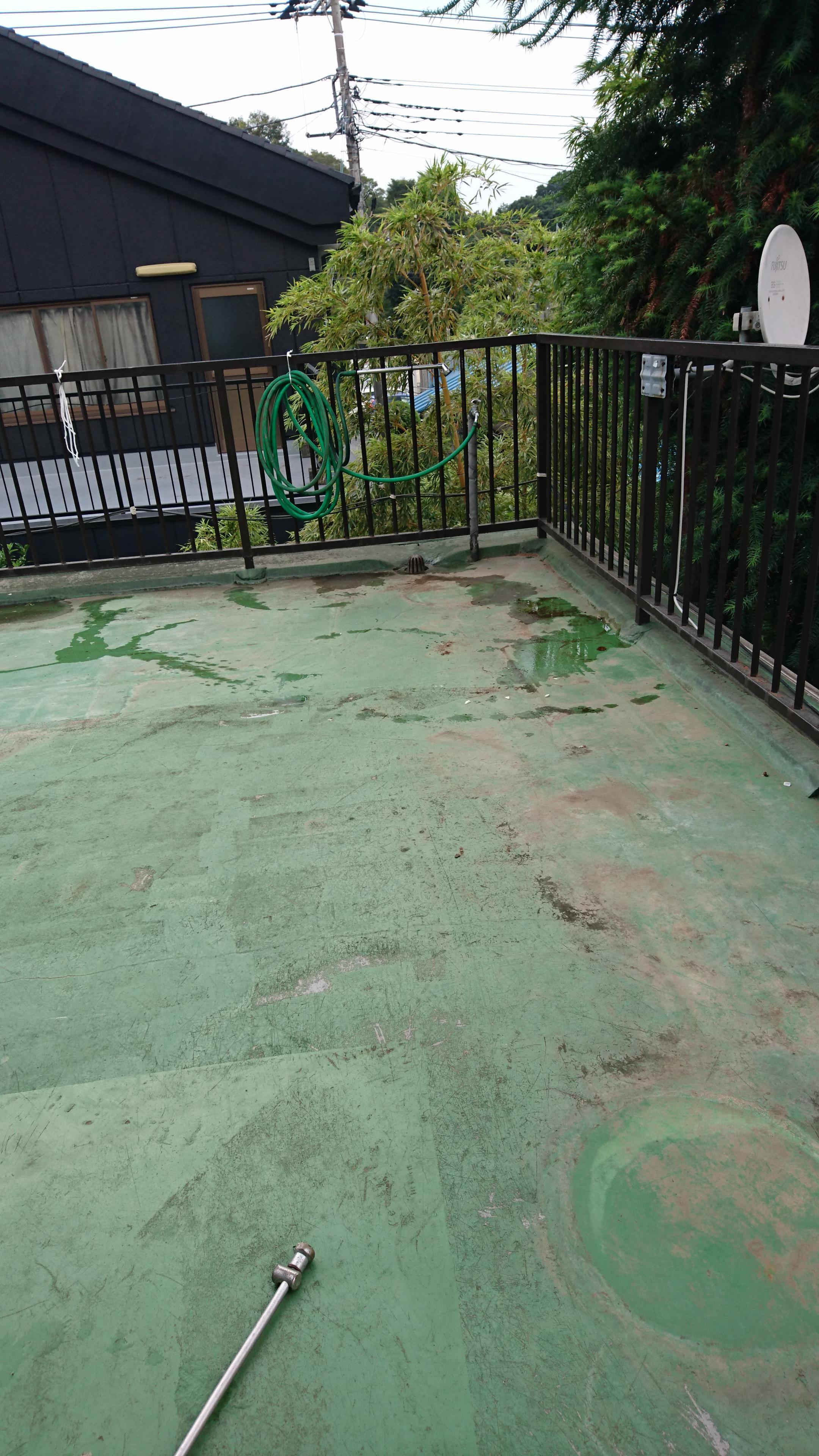 今回は防水工事をさせていただきました。 こちらのお家は以前お風呂の工事をさせていただいたお客様で、台風で雨漏りがしたのでご連絡いただきました。 こちらのお宅はとってもベランダがひろく、以前は鉢植えが100鉢以上あったそうです。 おかげで日差しが防水に入らなかったのか50年一度も防水工事をしていなくて、今回初めて防水のリフォームをしました。 ところどころ亀裂が入っていたり、防水層もかなり薄くなっていましたので補修ではなく全面塗らせていただきました。 工事が決まってからも雨の日が続きなかなか着工することができず…。 なんとか雨が4日間降らないところで工事をさせていただきました。 この後にきた台風の時には安心して生活できたと喜んでいただきました。