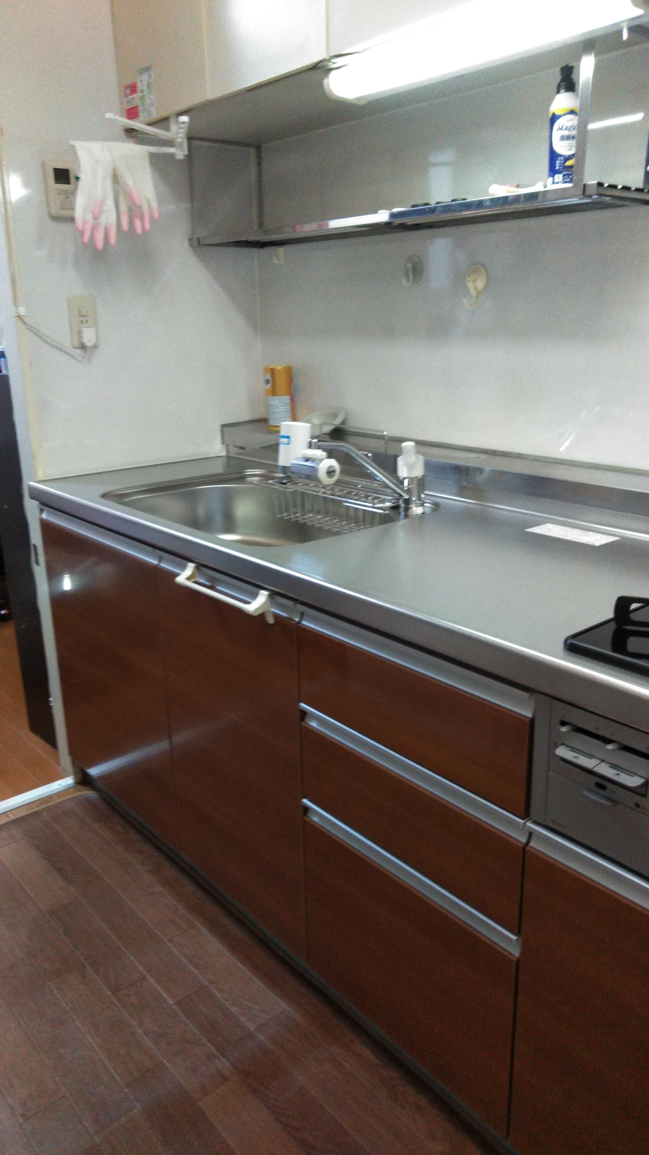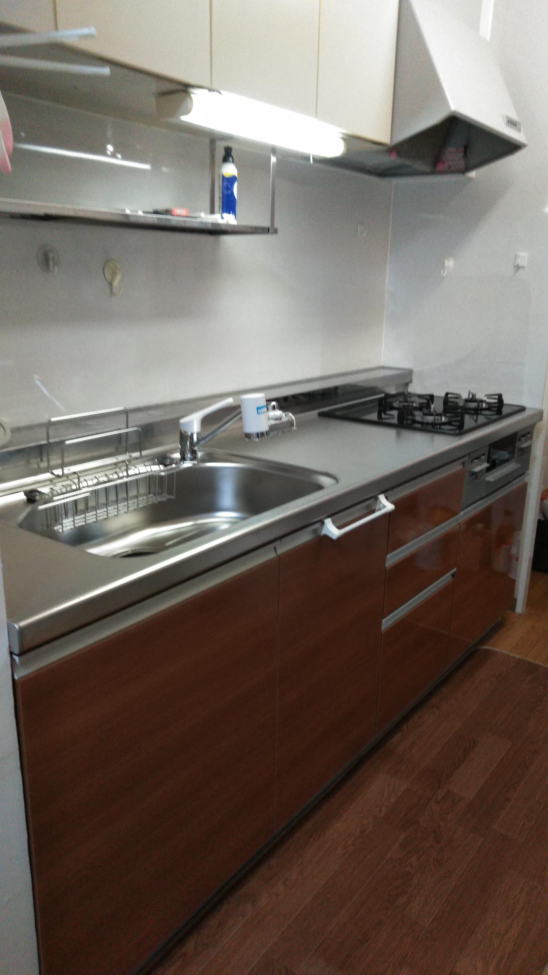 今回はキッチンのリフォームをさせていただきました。 マンションにお住まいのお宅で配水管がちょっと変わったタイプでした。 その為引き出し式のシステムキッチンが入りませんでした。 吊戸と換気扇はそのまま使用することにして、下台と水栓、ガスコンロの交換になりました。 工事の日程も一日で終わらせられる『パっとりくん』という商品。 ほとんどシステムキッチンと同じようなつくりなのですが、金額的実もお求めやすいです。 ただし、引き出しタイプはないのでそこだけご注意です! 以前のキッチンがアイボリーだったので、雰囲気も変えて木目にしました。 光沢もあり、色も落ち着いて家具のような仕上がりです。 以前は作業スペースが狭く、まな板を置くとボウルがおけなかったのですが、シンク位置を寄せたことで作業スペースを広くとることが出来ました。 以前からご利用になっている浄水カートリッジもそのまま使用することが出来ました。