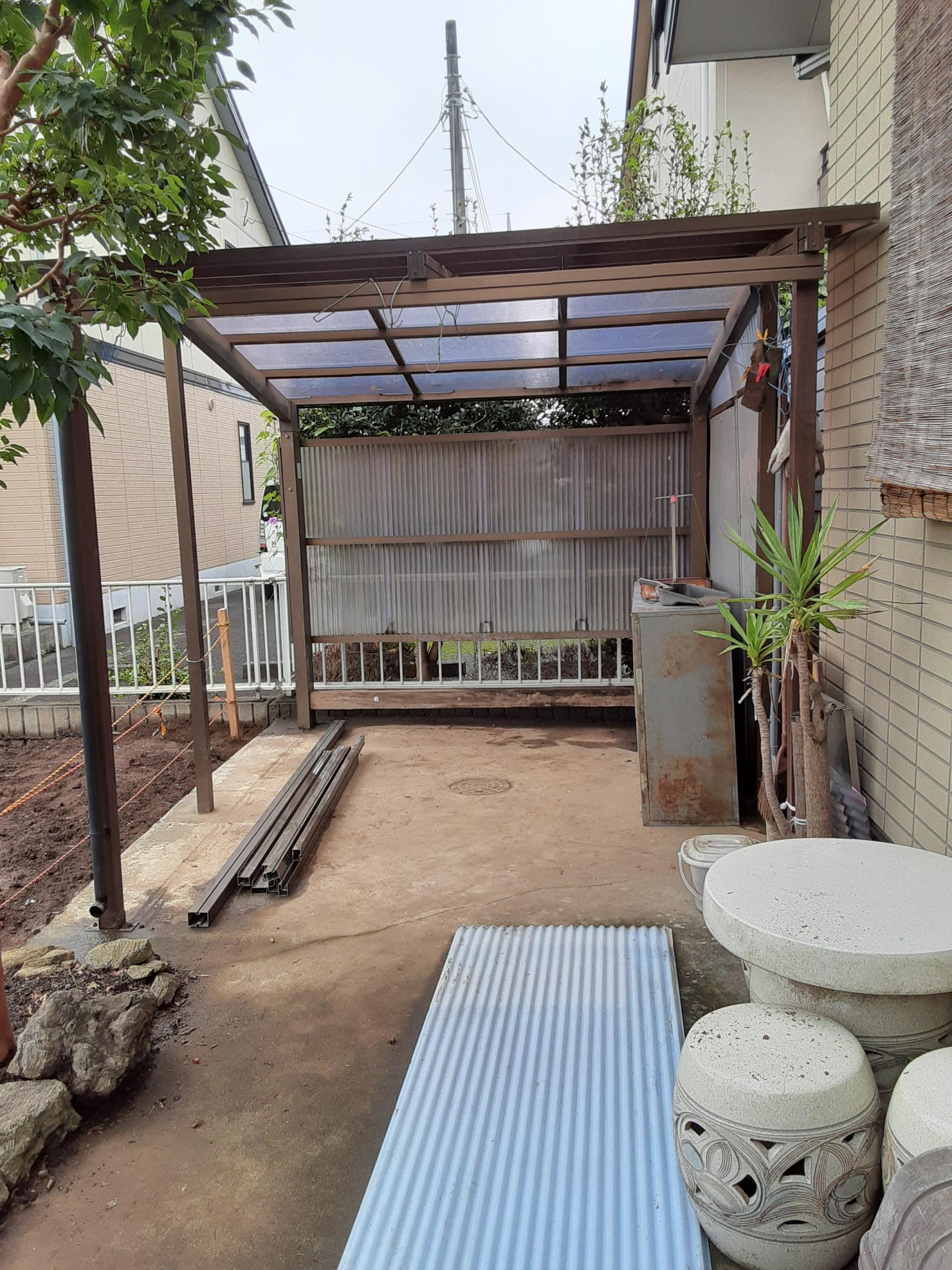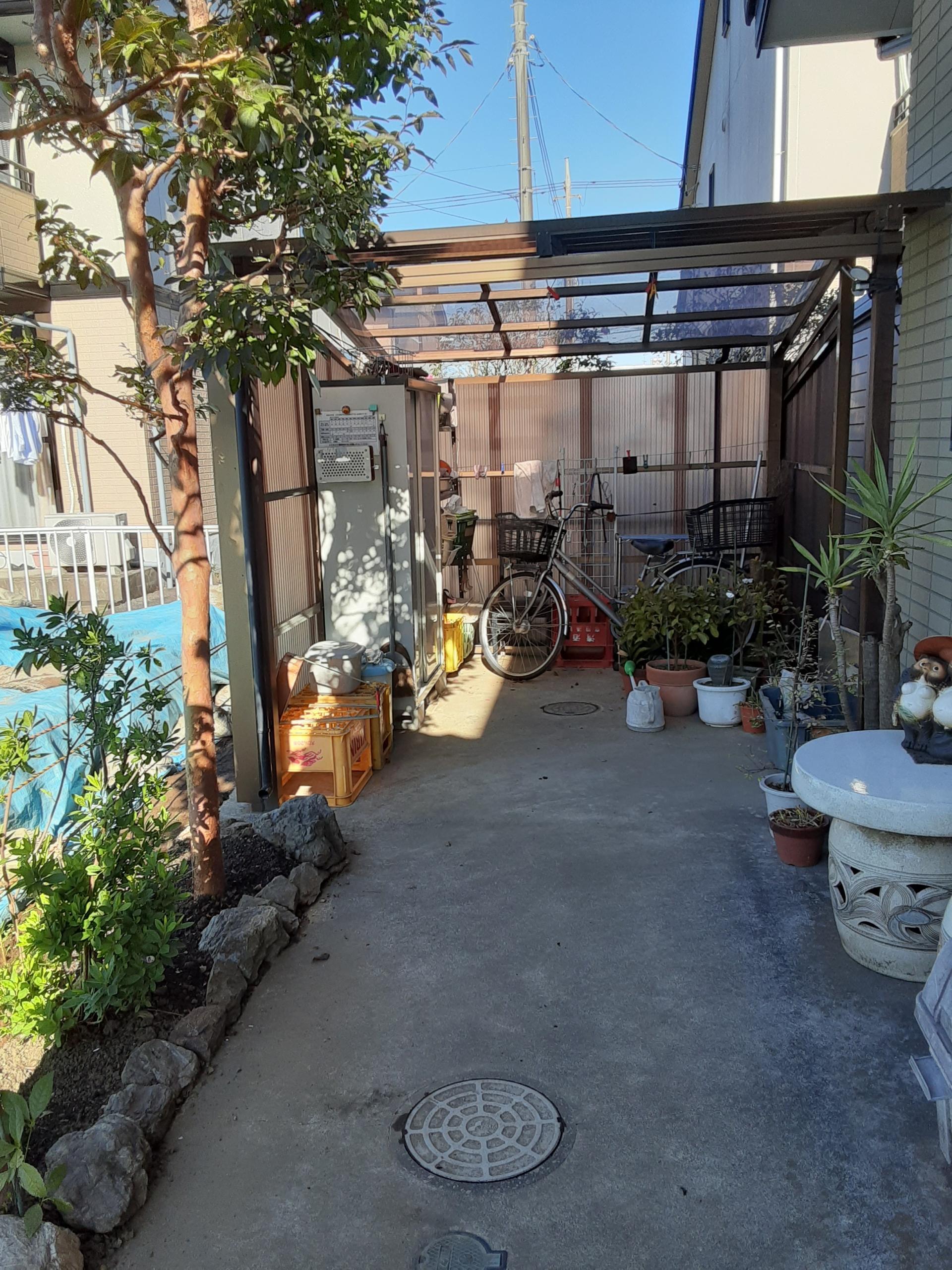 ご近所にお住まいのT様よりご自宅のサイクルポートを波板で3方を囲い、物置として使用したいとのご依頼でした。 以前は隣との境にブロック塀が有り、雨除け目隠しにもなっておりましたが解体されご不便されておりました。 サイクルポートの増築された部分と既存の部分の柱の通りがずれており少し手間取りました。 既存の部材も一部再利用し、イレギュラーな工事ではございましたが綺麗に仕上げることが出来ました。 耐久性を考慮してポリカの波板をお勧めし、万が一の強風の為に風の逃げ道の確保についてもご説明しご理解頂き工事を進める事が出来ました。 物置、自転車、植物をひとところに整理整頓され、玄関周りがよりすっきりされております。