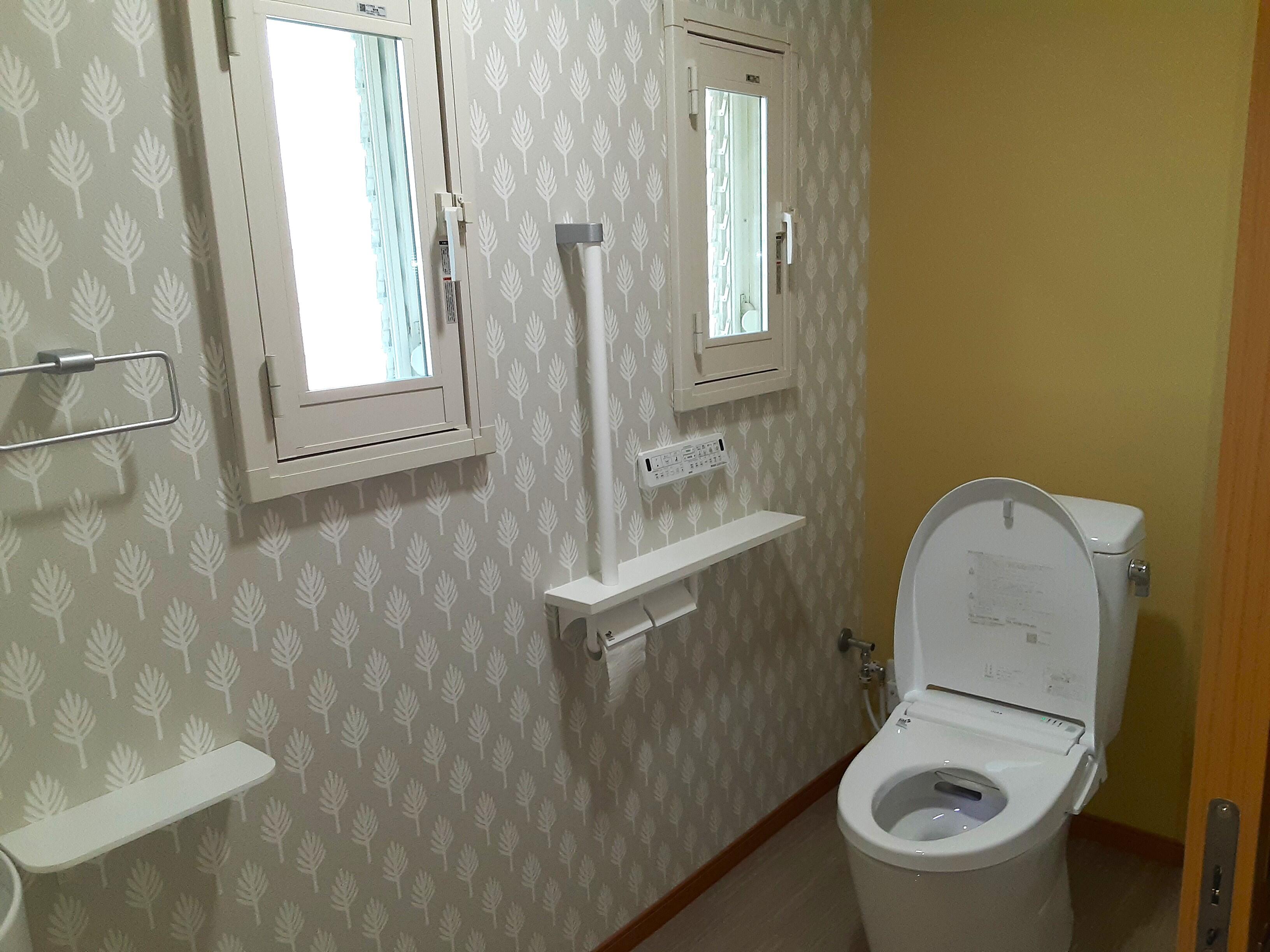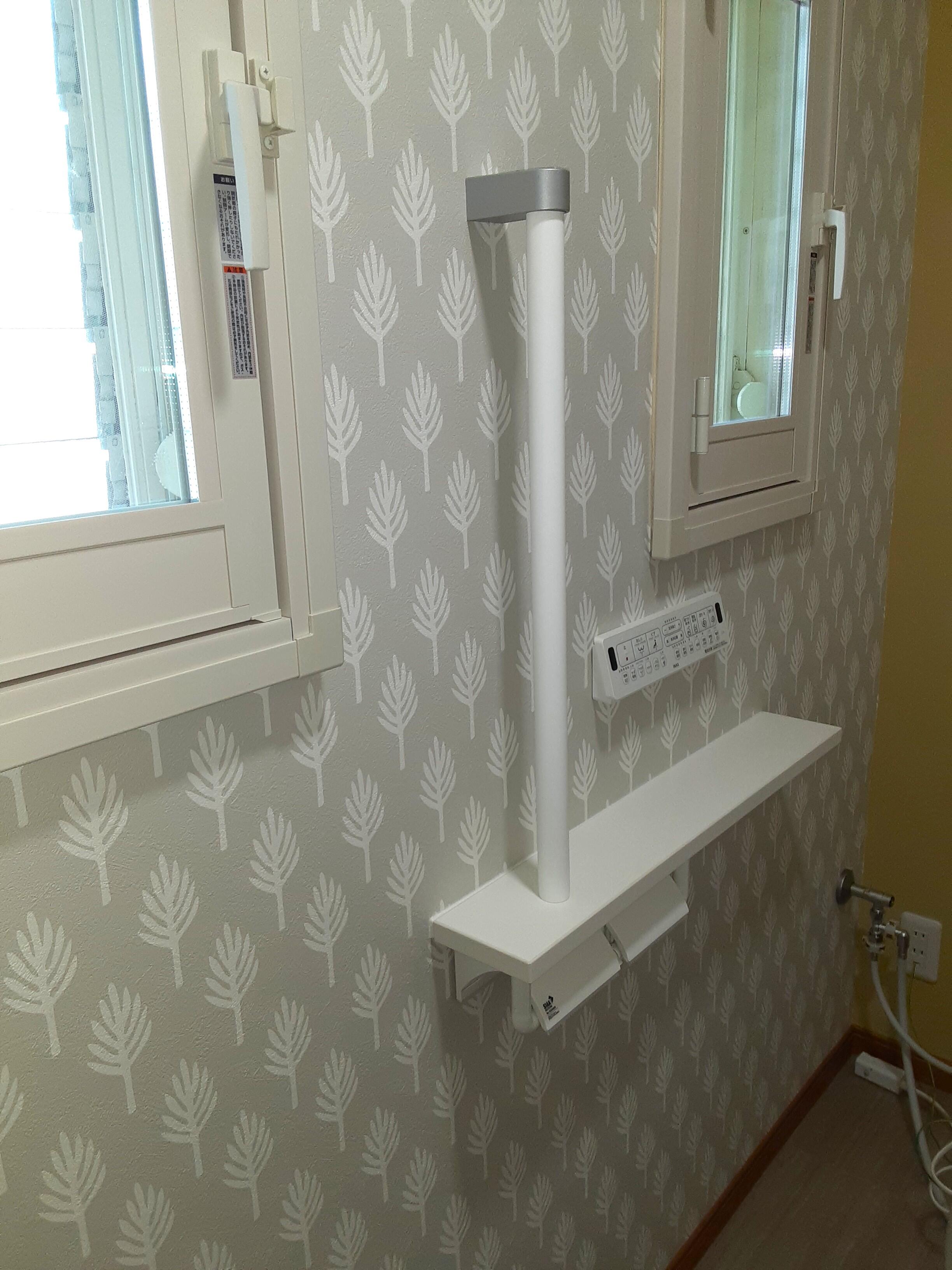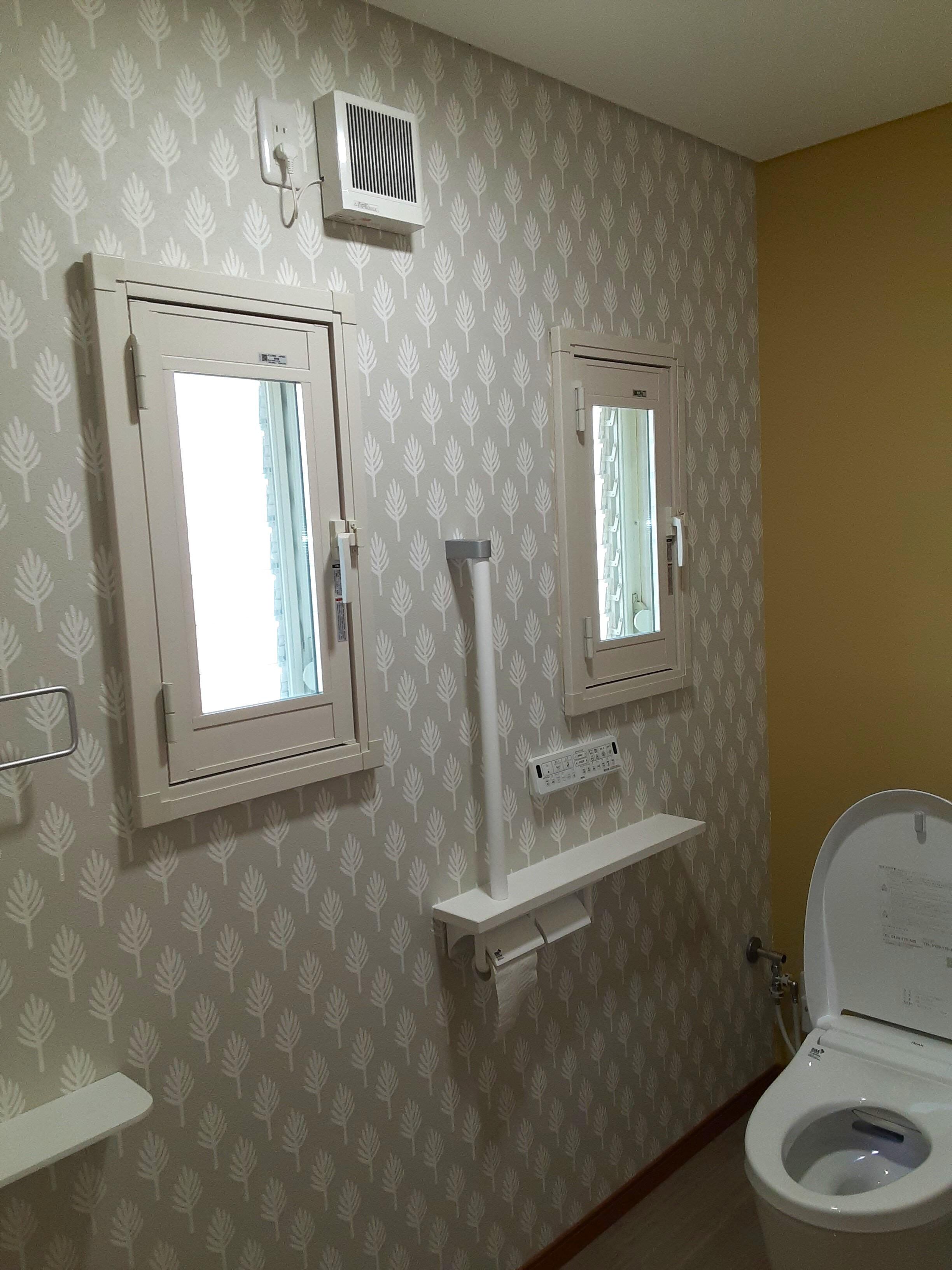 広いスペースに横並びに洋便器・小便器・手洗器と設置されていましたが、使い勝手の良い配置にアメージュと手洗器を設置しました。壁・床がタイル張りのため、冬場寒く感じていたのでお気に入りのクロスに張替え、トイレ室内の2ヶ所のルーバー窓に内窓を設置し断熱効果が格段にアップしました。トイレの入口の13㎝の段差を解消し、入口幅を7㎝拡張しました。紙巻器の上部に手摺りを取付け、将来を見据えたバリアフリーリフォームをすることで、安心・快適な環境づくりができたと思います。