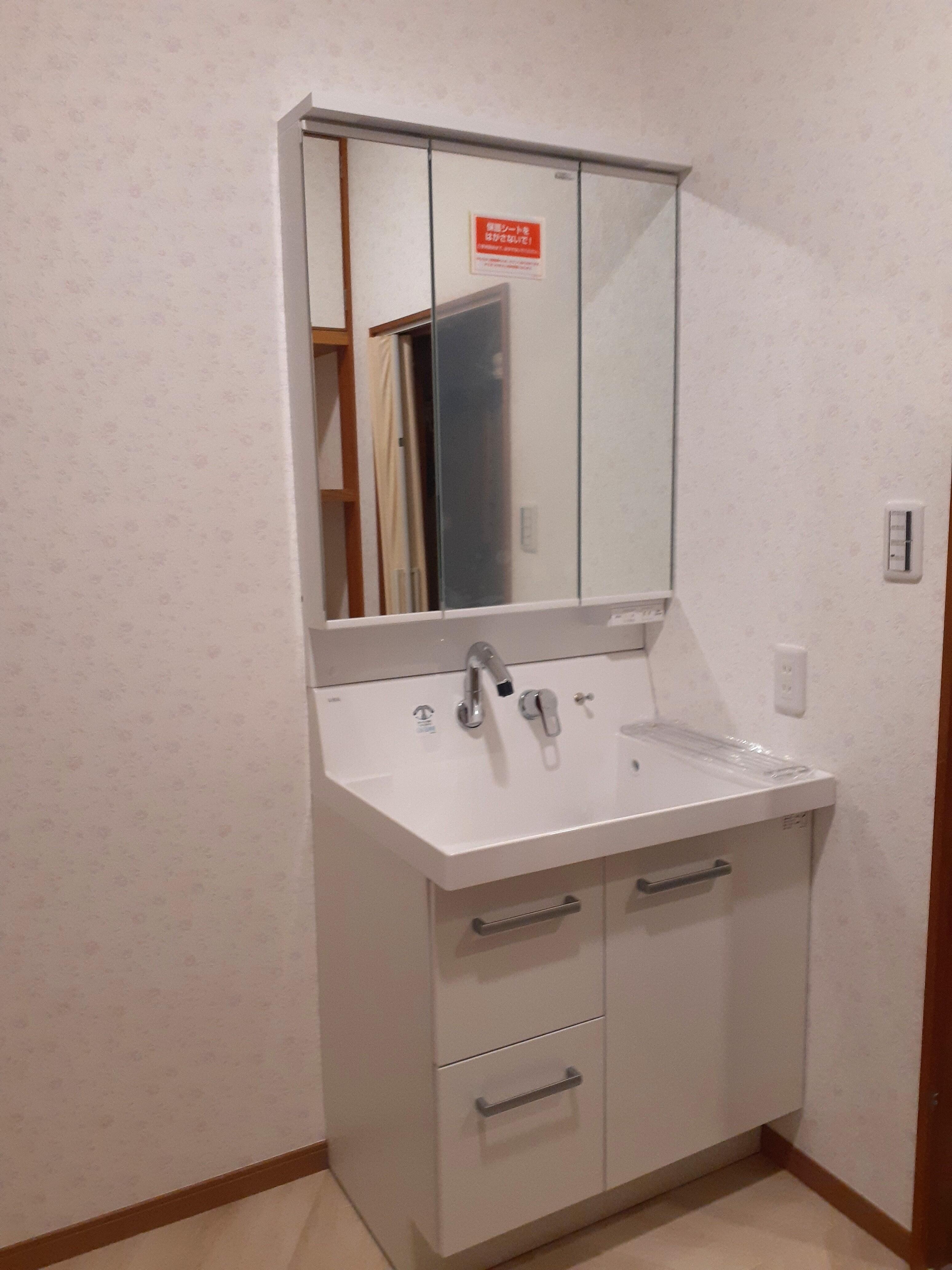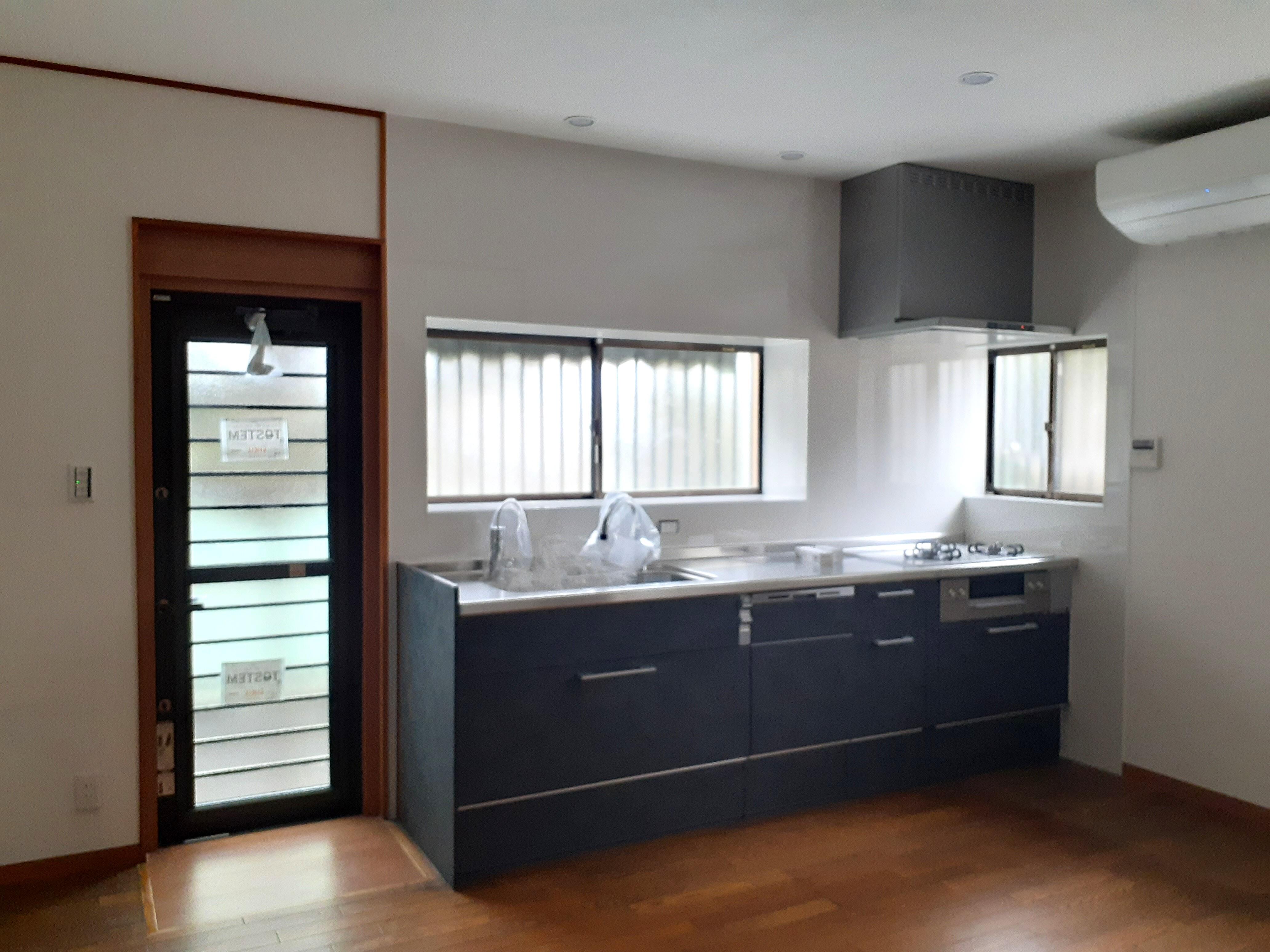 4畳の広さの浴室は間取りを変更、洗面所を広げる為に境界変更による壁を造作しました。寒さの気になるタイルの浴室から、リデアを採用いただき保温材をプラスしたバスルームはあたたかさをキープします。バリアフリー化・浴室暖房乾燥機を設置し将来の安心に備えました。キッチンは使い勝手を考慮してL型からI型へ変更をご希望されシエラをお選びいただきました。勝手口ドアは横格子の採風タイプで自然の風を取り込みます。洗面化粧台は2台並ぶダブル洗面の仕様でしたが、スペースの有効活用を考えピアラを1台設置いたしました。