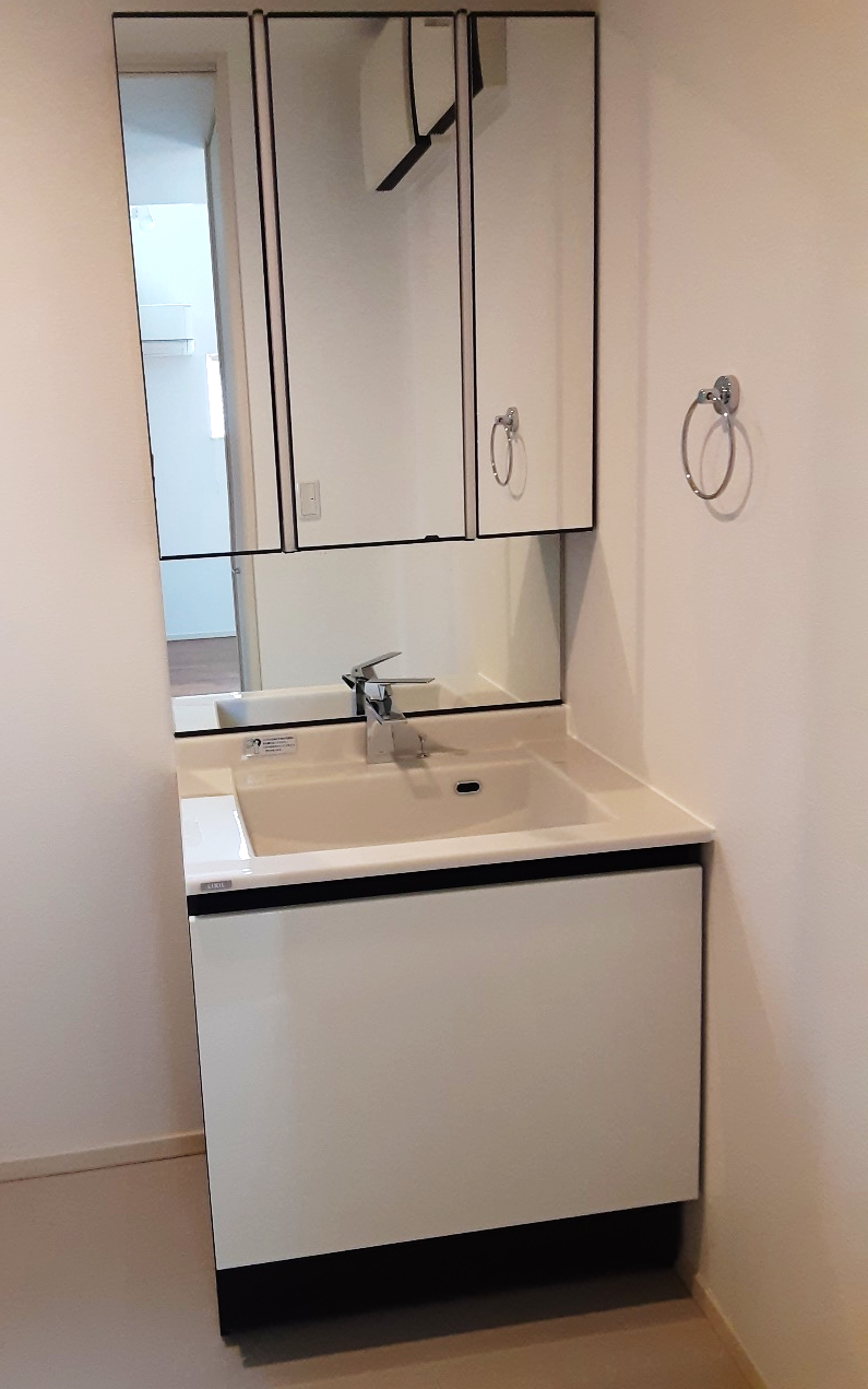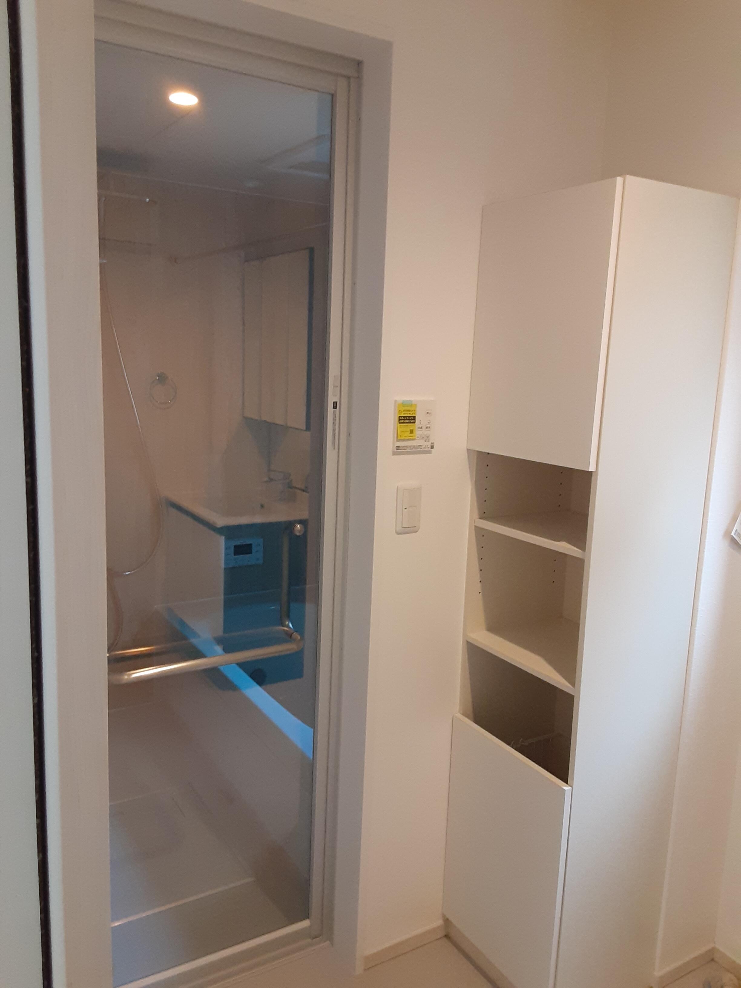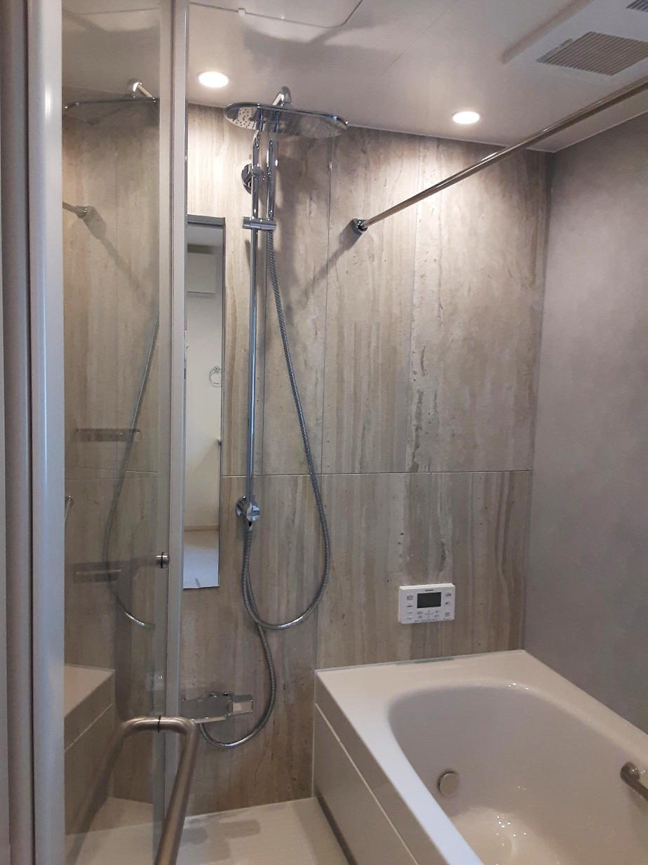 浴室はハイグレードなシステムバス スパージュ、洗面化粧台はルミシスボウル一体型を採用いただき、システムキッチンは流用し食洗器を設置しました。浴室・洗面・キッチンの水栓はいずれもお気に入りのドイツ製のグローエを選ばれ、浴室ドアは一般宅ではあまり例がない220㎝のハイタイプを設置し、まるでホテルのような高級感のある空間になりました。随所にご夫婦のこだわりの設備工事を行いました。食洗機の設置にあたり、廃番のシステムキッチンと同様の面材を探すことができたことも、今回ご依頼を頂いた決めてとなりお喜びいただきました。