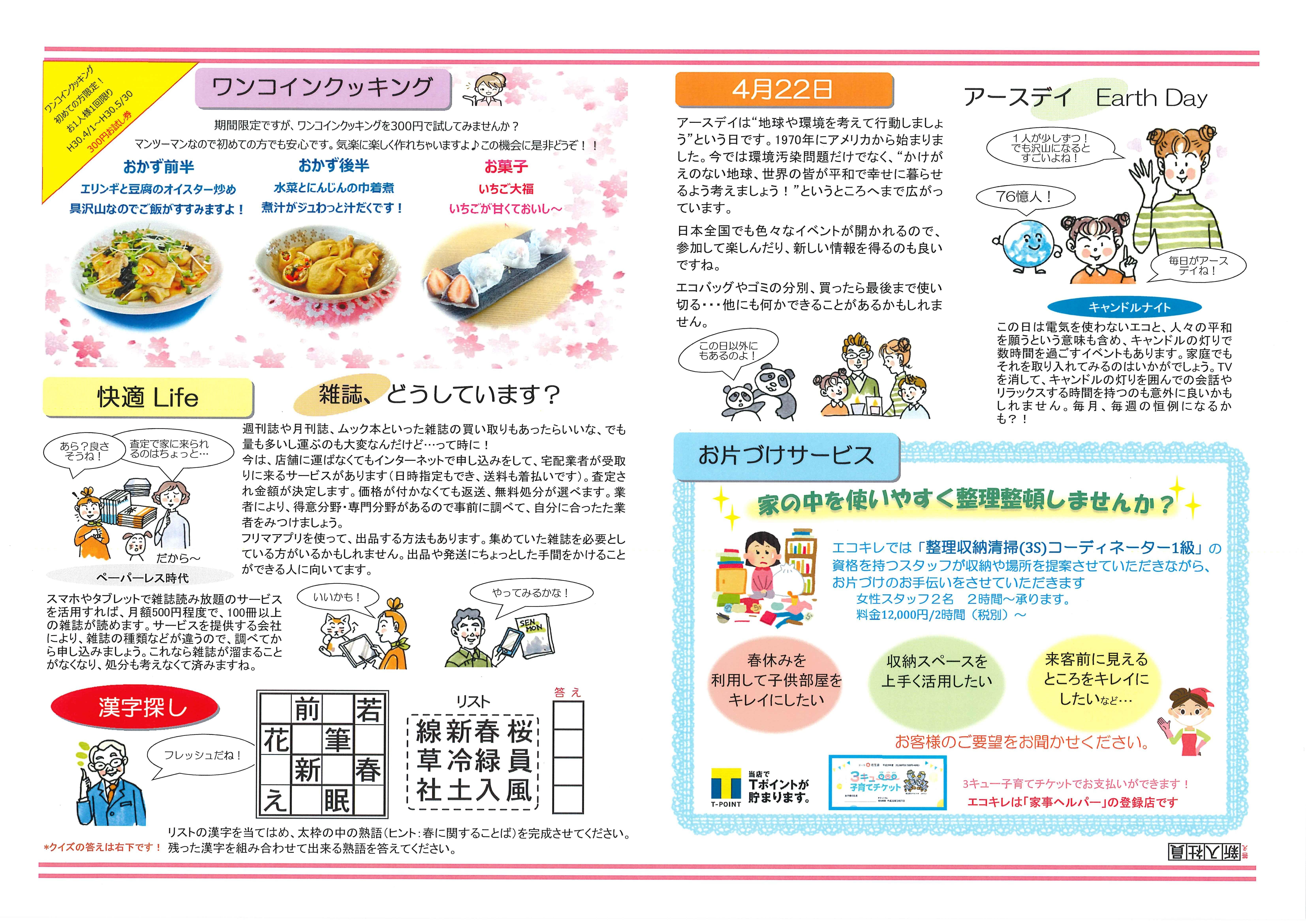 また、4月のワンコインクッキングのメニュー、お片づけサービスのご案内もしております。
