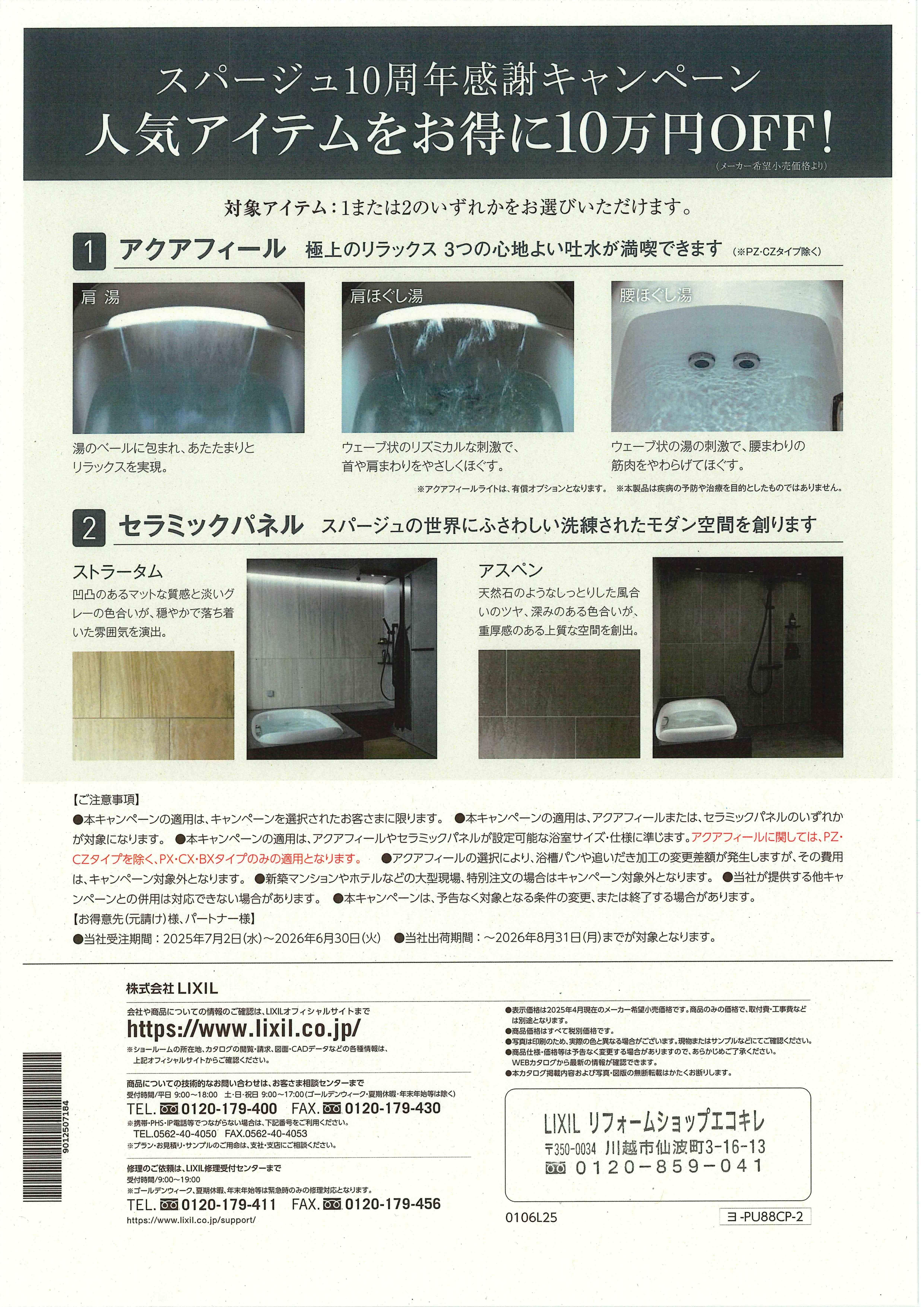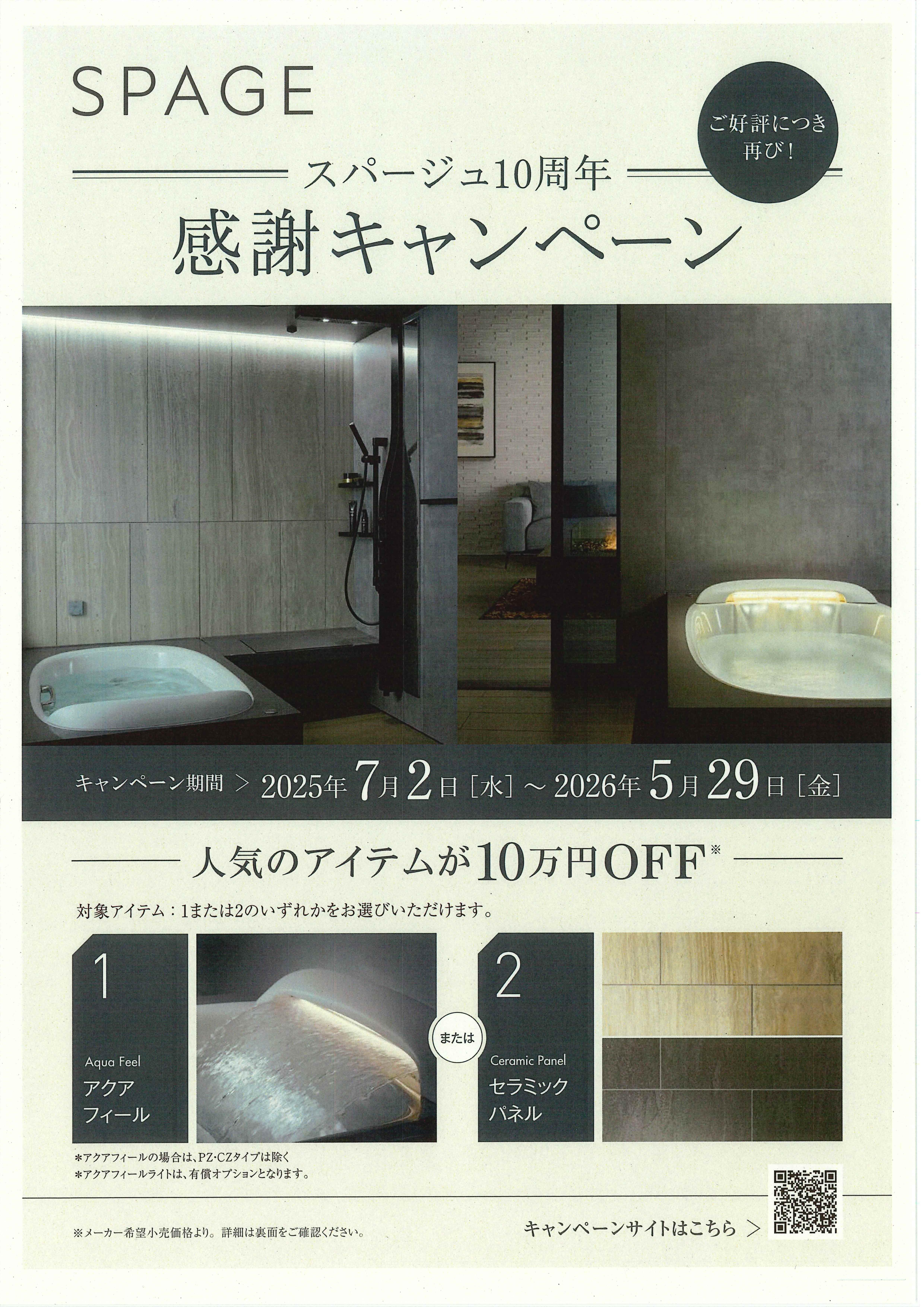 システムバスルーム「スパージュ」は10周年を迎え、大好評だった第1弾キャンペーンに続き、第2弾キャンペーンを実施しています。前回同様、人気アイテムの『アクアフィール』『セラミックパネル』いずれかをお選びいただきますと、もれなく10万円割引きとなります。