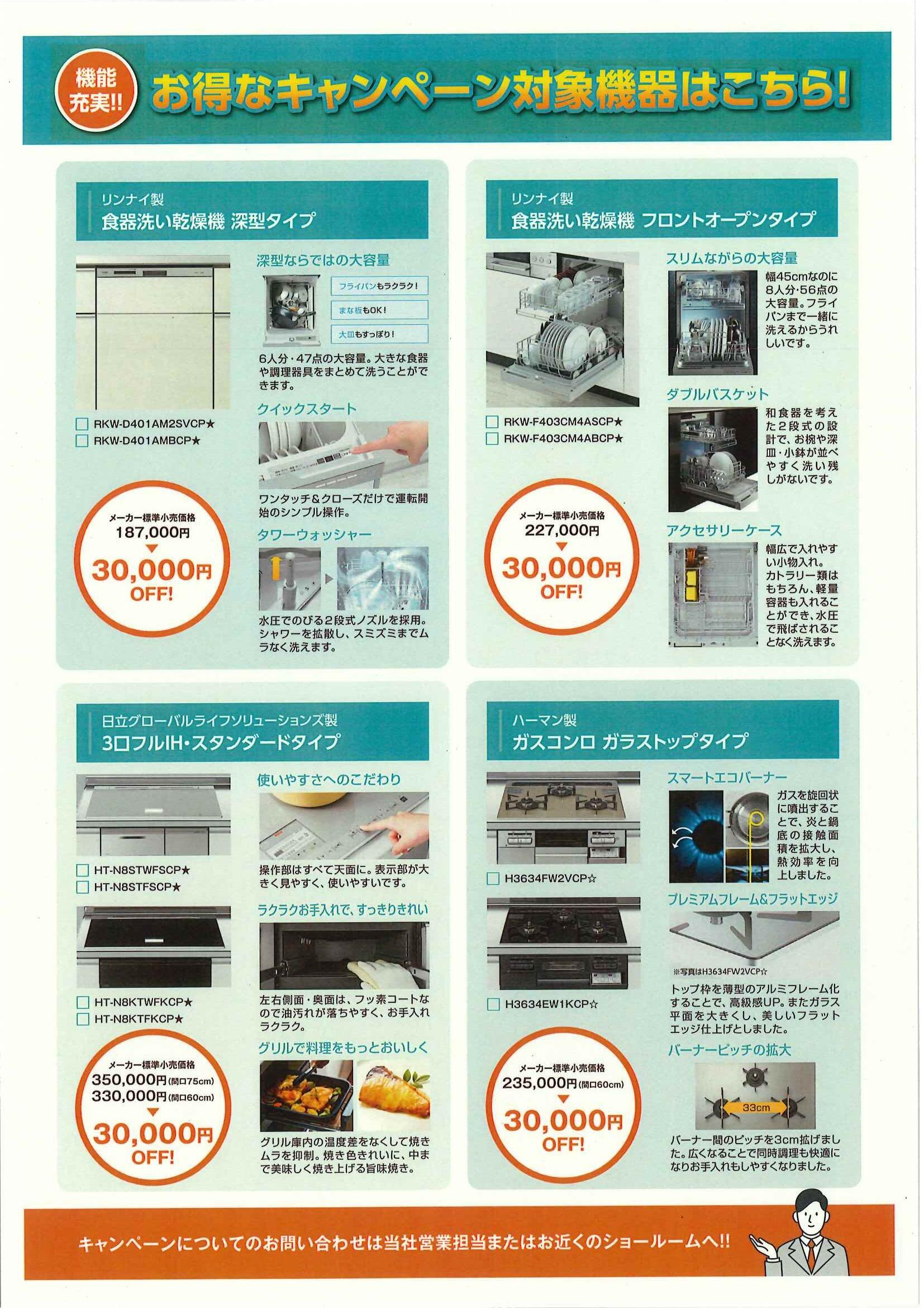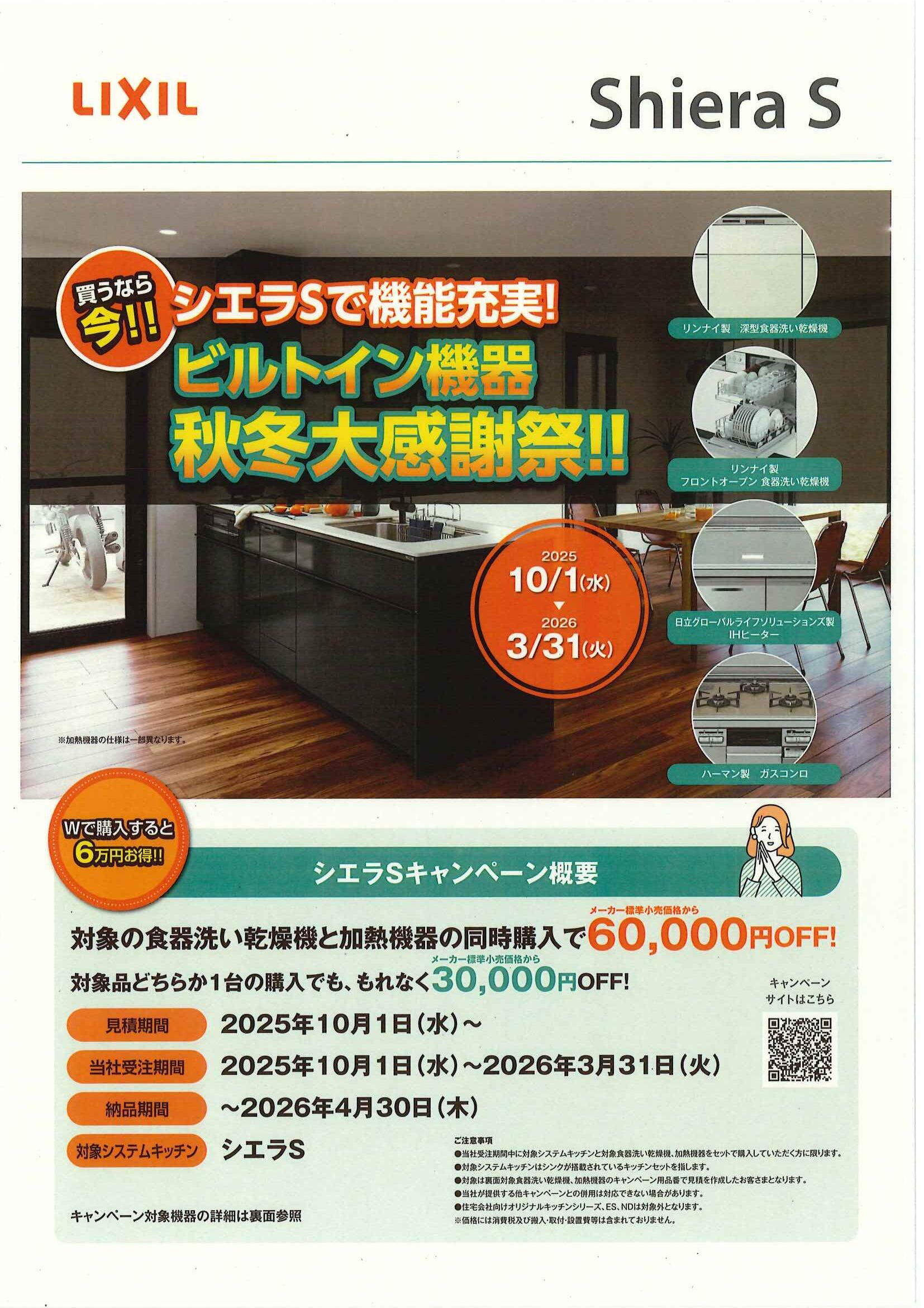 「シエラS」をお選びいただき、対象のビルトイン機器を同時購入しますともれなく割引となる秋冬大感謝祭を実施しています。食器洗い乾燥機と加熱機器の同時購入で6万円割引きに、対象品どちらか1台の購入でももれなく3万円割引きになります。